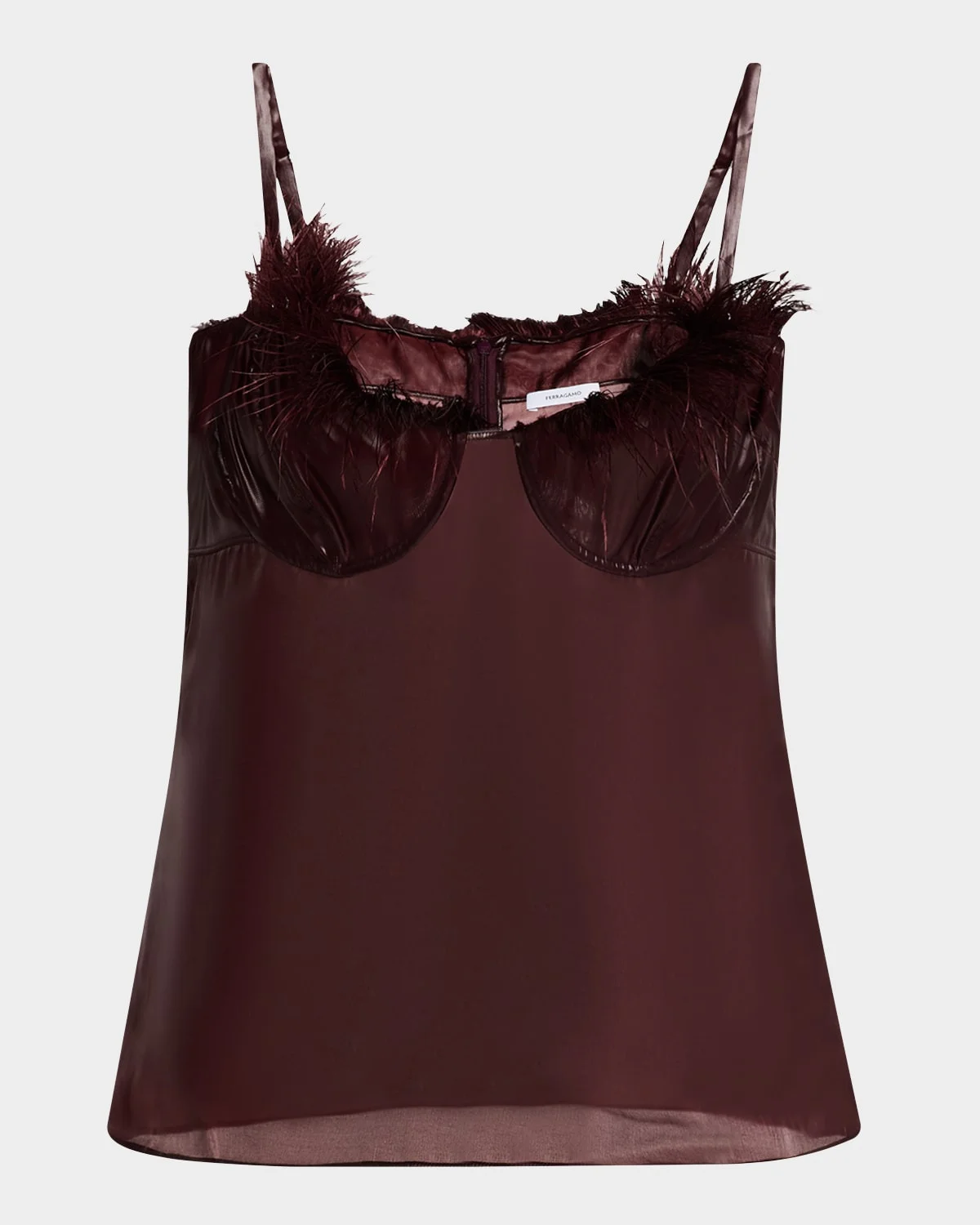 Ferragamo waxcoated sheer camisole with ostrich feathertrimmed bustier Sweetheart neckline Sleeveless; adjustable spaghetti straps Relaxed fit Back zip Nylon/polyamide/silk/feather Made in Italy