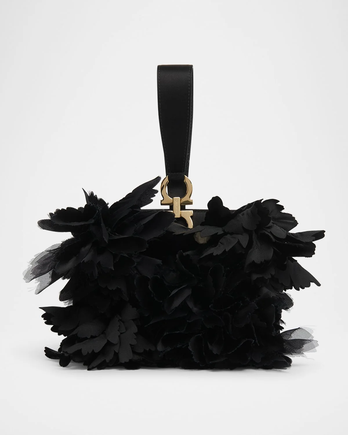 - Ferragamo wristlet bag in leather flutters with 3D floral applique - Wristlet strap with double Gancini detail - Framed top with magnetic closures - Interior, one card slot - Lining: Silk/viscose - Approx. 6.1"H x 8.1"W x 3.9"D - Made in Italy