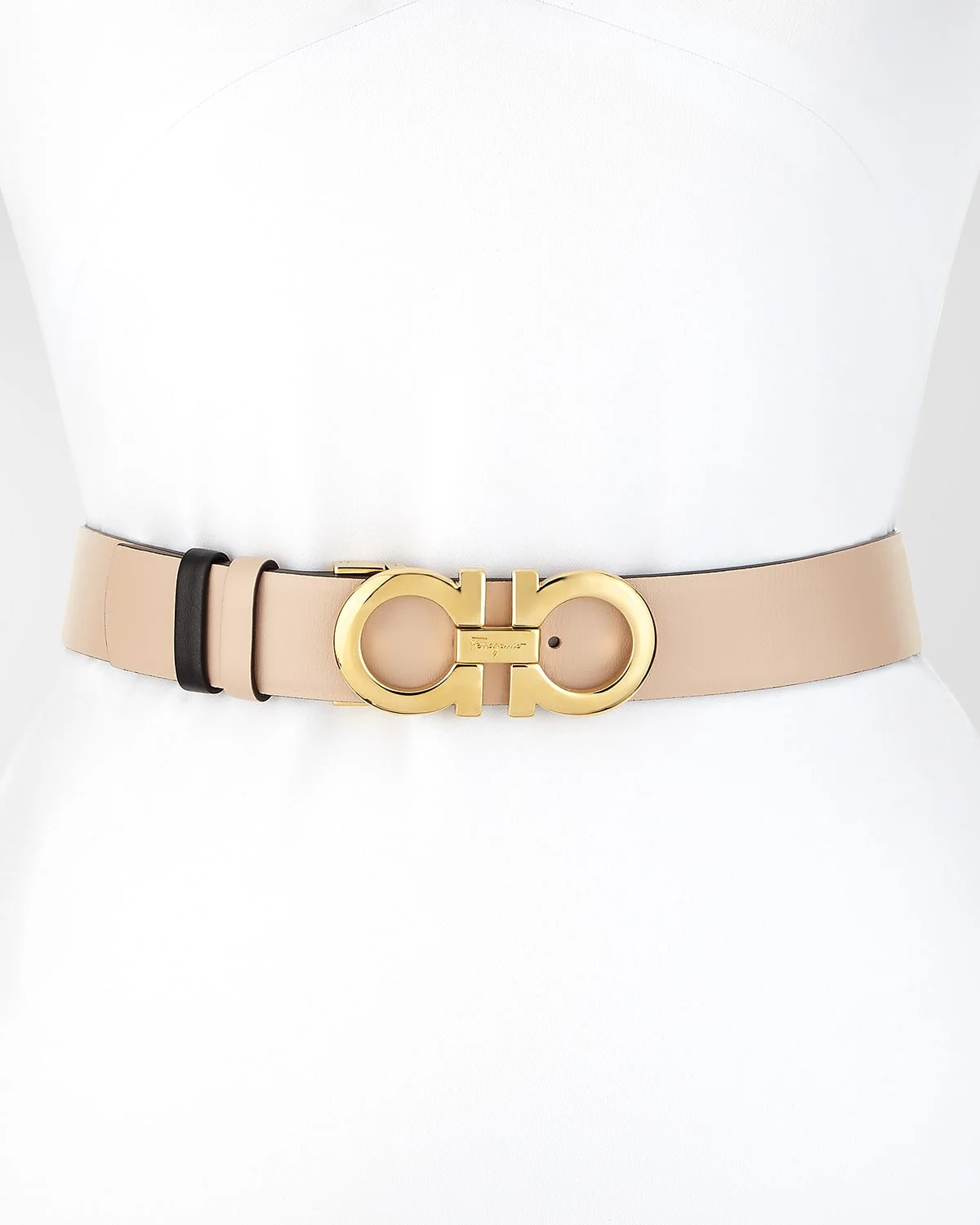 - Ferragamo belt in embossed leather. - Signature double-Gancini buckle with leashed keeper. - Reversible to solid black. - Golden hardware. - Approx. 1.4"W. - Cut to size. - Made in Italy.