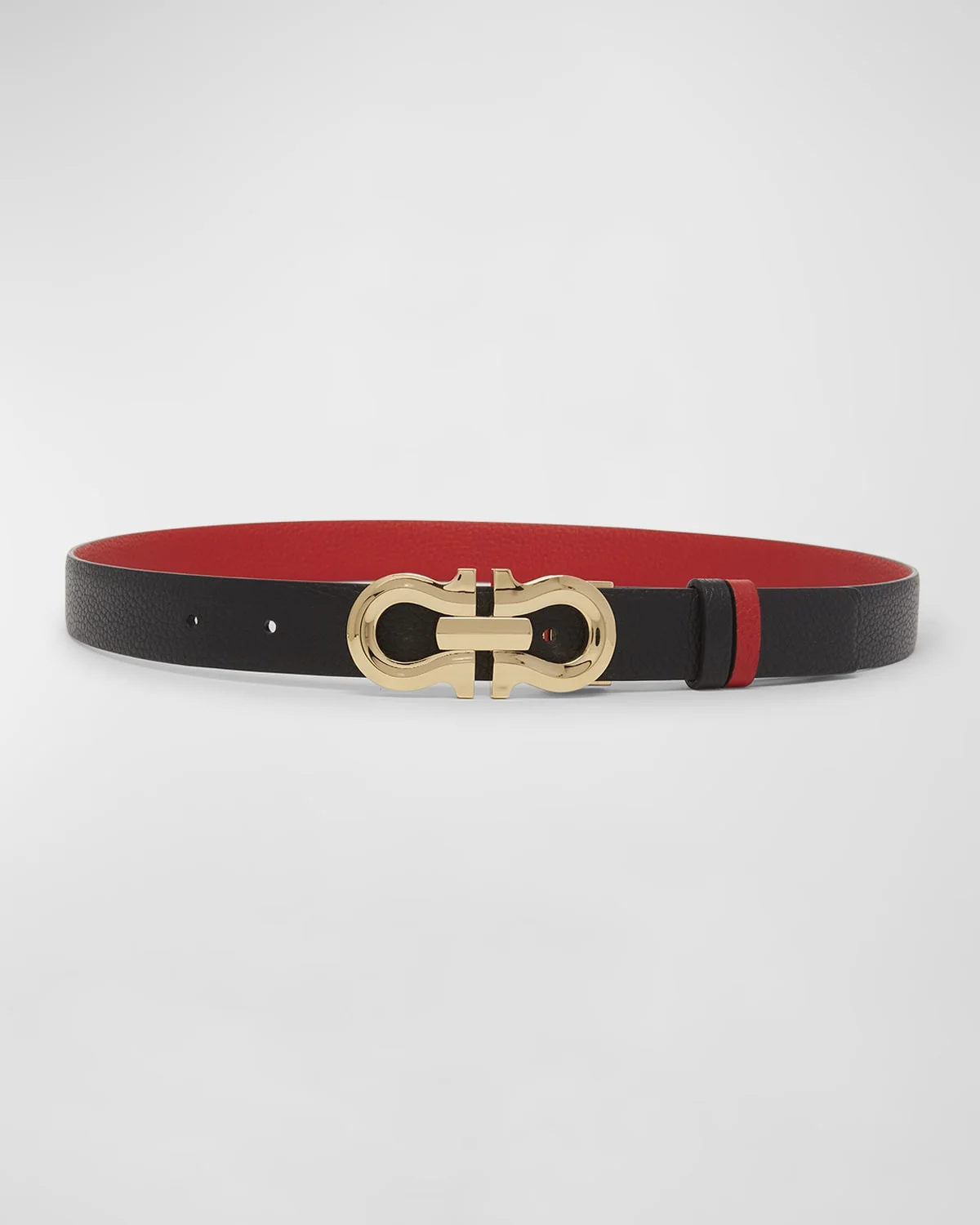 - Ferragamo "Gancio Contour" reversible belt in pebble-grain leather with golden hardware - Approx. 1"W - Cut to size - Adjustable fit - Gancini buckle - Two-tone loops - Professional cleaning recommended - Made in Italy