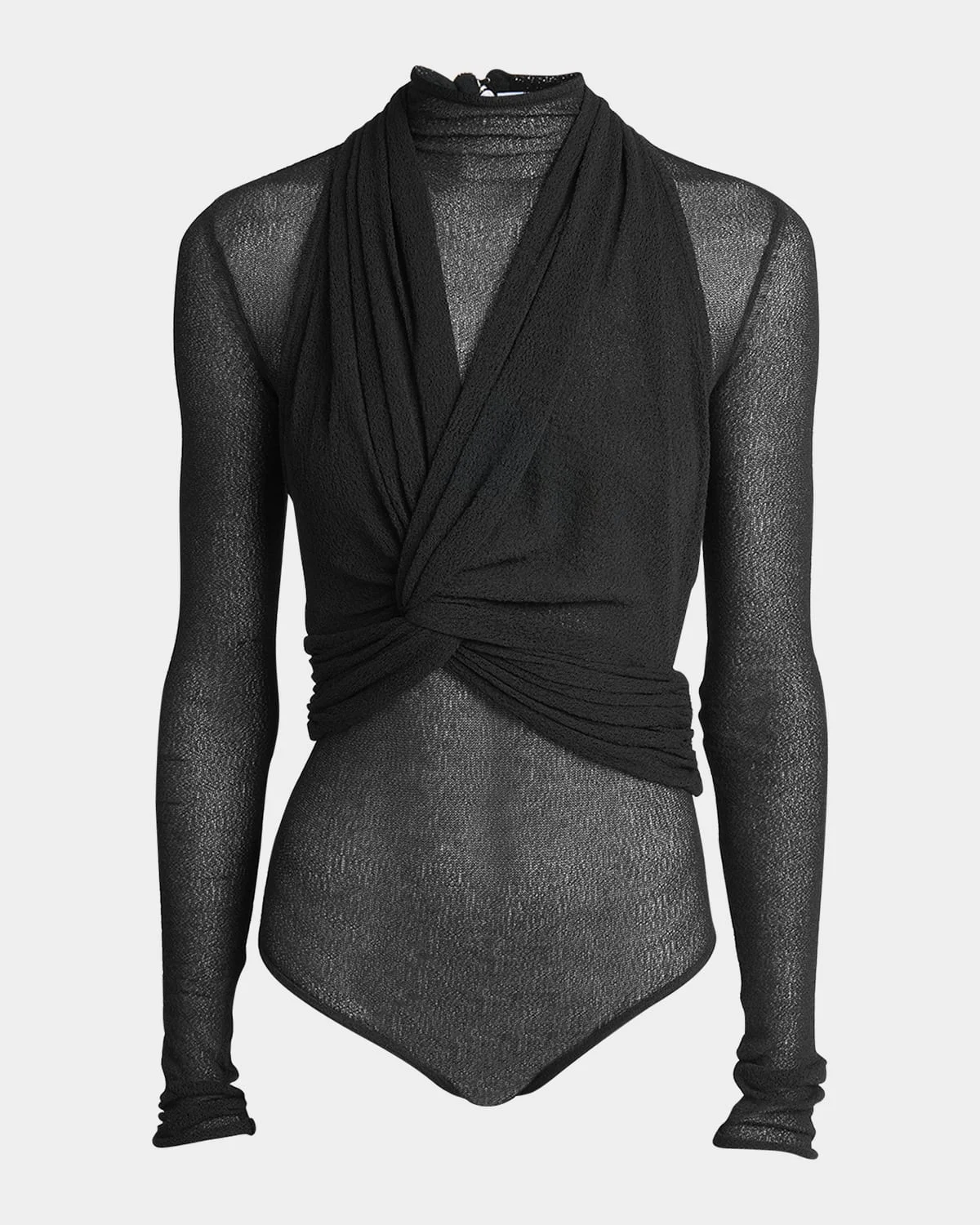 Ferragamo sheer bodysuit with knotted sweater overlay High neckline Long sleeves Slim fit Moderate seat coverage Back zip Viscose/nylon/polyamide Professional cleaning recommended Made in Italy