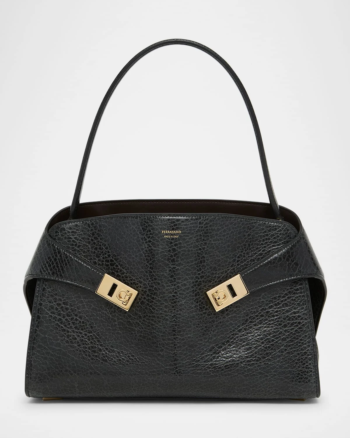 - Ferragamo "Hug" shoulder bag in maxi grain leather with colorblock interior - Shoulder strap - Detachable, adjustable crossbody strap - Can be worn as a shoulder or crossbody bag - Fold-over flap top with magnetic closure - Gancini side buckle straps - Center zip divides interior, two slip pockets - Feet protect the bottom of the bag - Approx. 10"H x 13.4"W x 6.1"D - Made in Italy