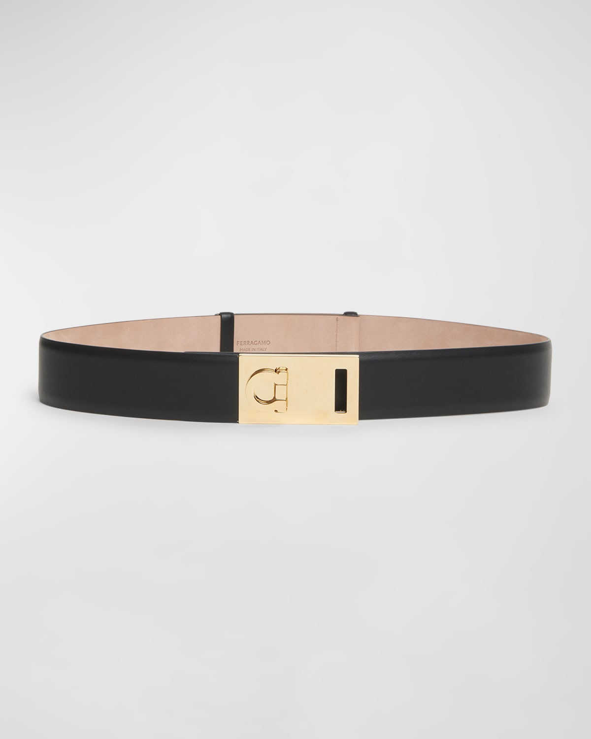 - Ferragamo "Hug" belt in leather with golden hardware - Approx. 1"W - Cut to size - Gancini buckle - Professional cleaning recommended - Made in Italy