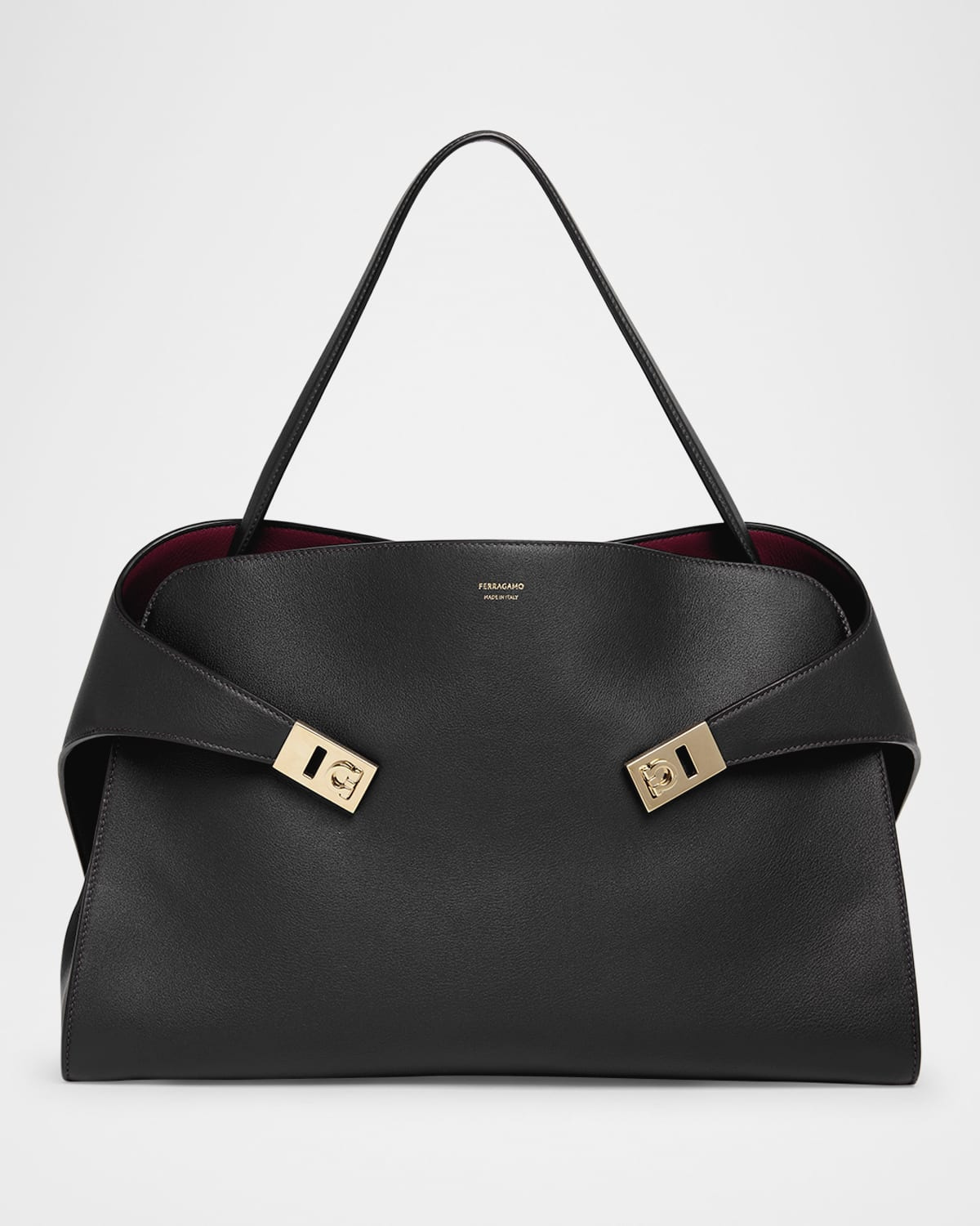 - Ferragamo "Hug" shoulder bag in soft calf leather - Shoulder strap - Open top with side Gancini clasp closures - Center zip compartment divides interior; two card slots - Contrast lining - Feet protect bottom of bag - Approx. 12"H x 15.7"W x 6.7"D - Made in Italy