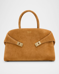 - Ferragamo "Hug" top handle bag in suede and leather - Rolled top handles with keyring tag - Detachable, adjustable crossbody strap - Can be worn as a top handle or crossbody bag - Open top with hook closure; side Gancini buckle straps - Interior, one zip pocket - Approx. 9.4"H x 15"W x 8.6"D - Made in Italy