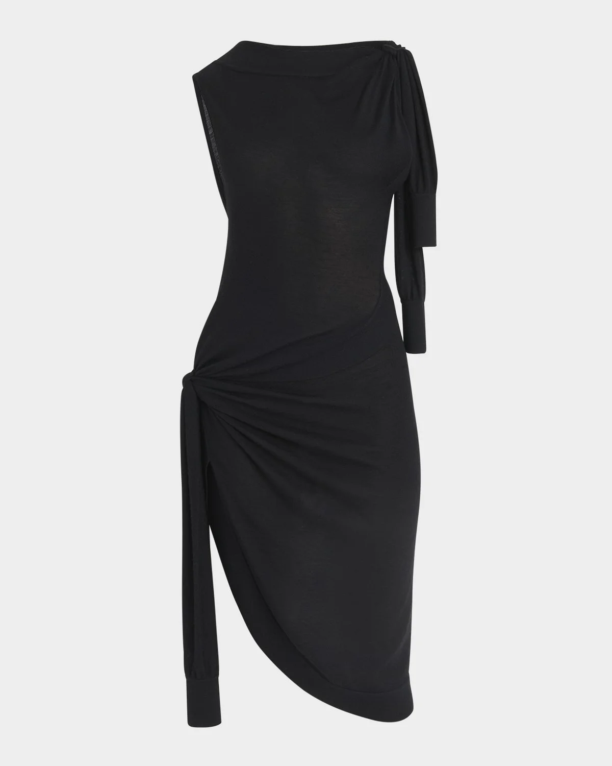 - Ferragamo dress featuring knotted tied along the shoulder and hip - High neckline - Sleeveless - Sheath silhouette - Hem falls below the knee - Hidden closure - Silk/cotton - Dry clean - Made in Italy