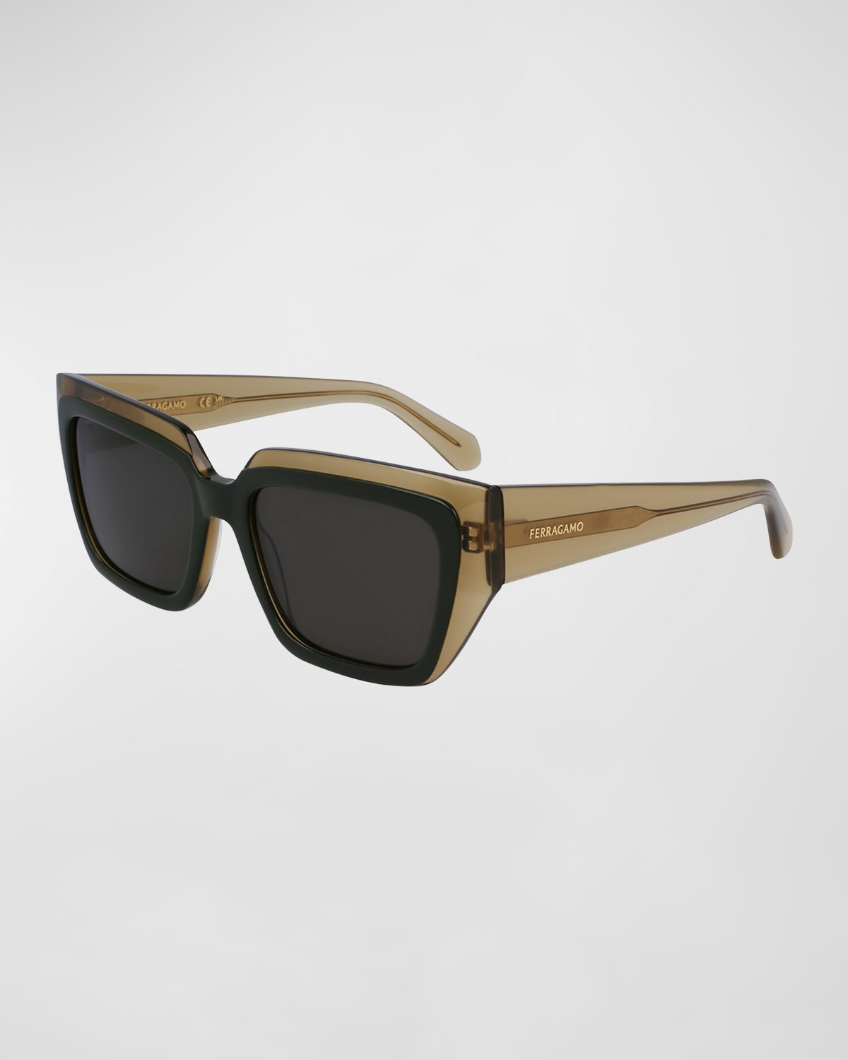 - Ferragamo beveled butterfly sunglasses in acetate - Lens/bridge/temple (in mm): 52-21-145 - Saddle nose bridge - Logo on temples - Wide, tapered arms - Wipe clean - 100% UVA/UVB protection - Made in Italy - Proposition 65 warning for California residents