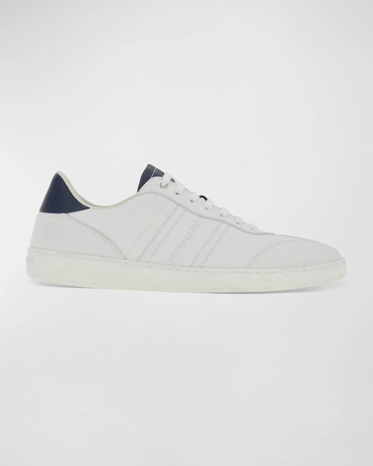 - Ferragamo "Achille 1" low-top sneakers in leather - Flat heel - Round toe - Lace-up vamp - Debossed logo at tongue and side - Padded collar - Fabric/leather lining - Raised logo at heel - Rubber outsole - Professional cleaning recommended - Made in Italy - Size Note: Item runs large, consider ordering a size down.
