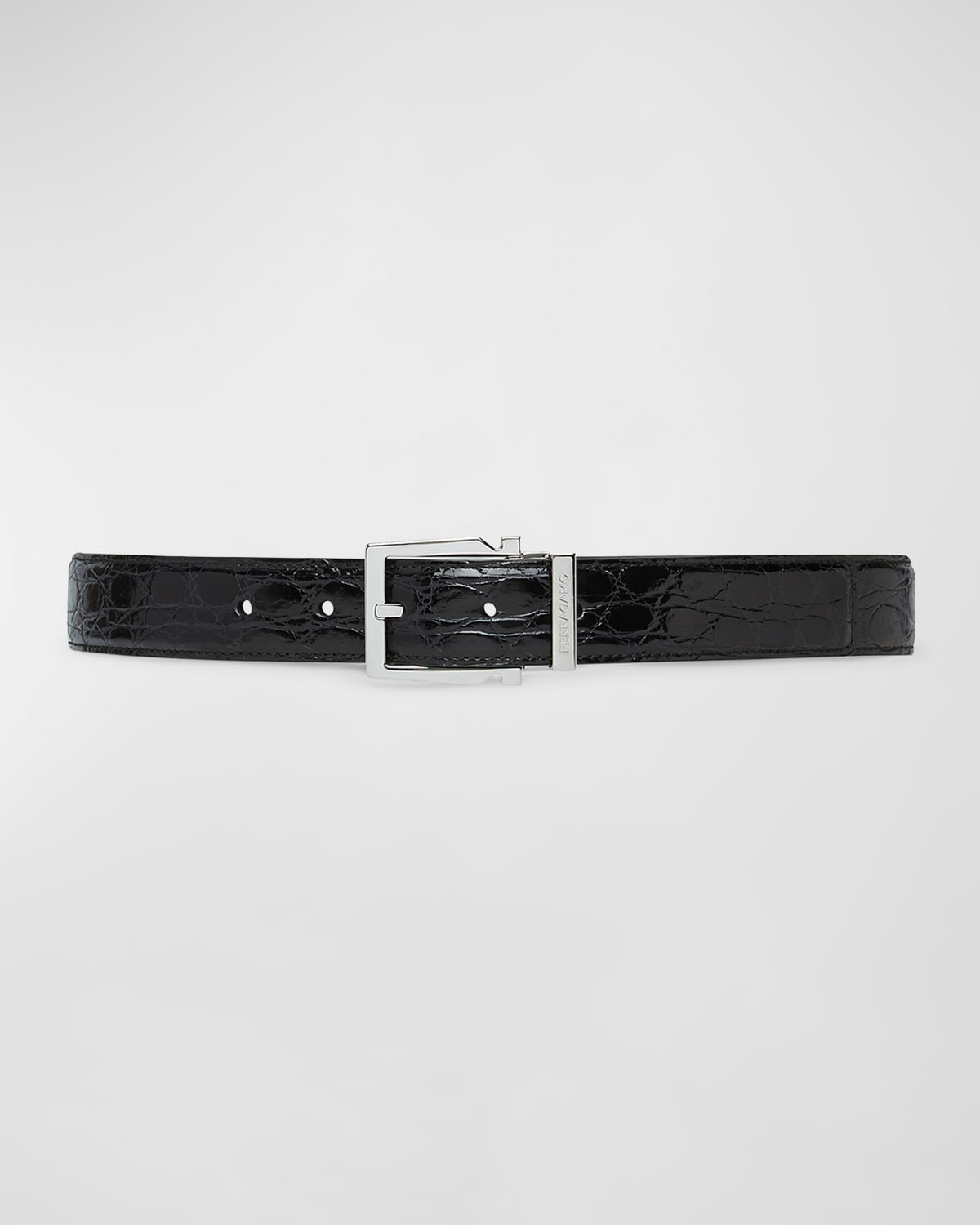 - Ferragamo belt made of the finest crocodile leather with calfskin lining - Approx. 1.181"W - Geometric Gancio buckle - Logo engraved metal belt keeper - The adjustable length allows for a more personalized fit and style - Easily cut the belt strap or punch another hole for a tighter or looser fit - Crocodile leather - Professional cleaning recommended - Made in Italy