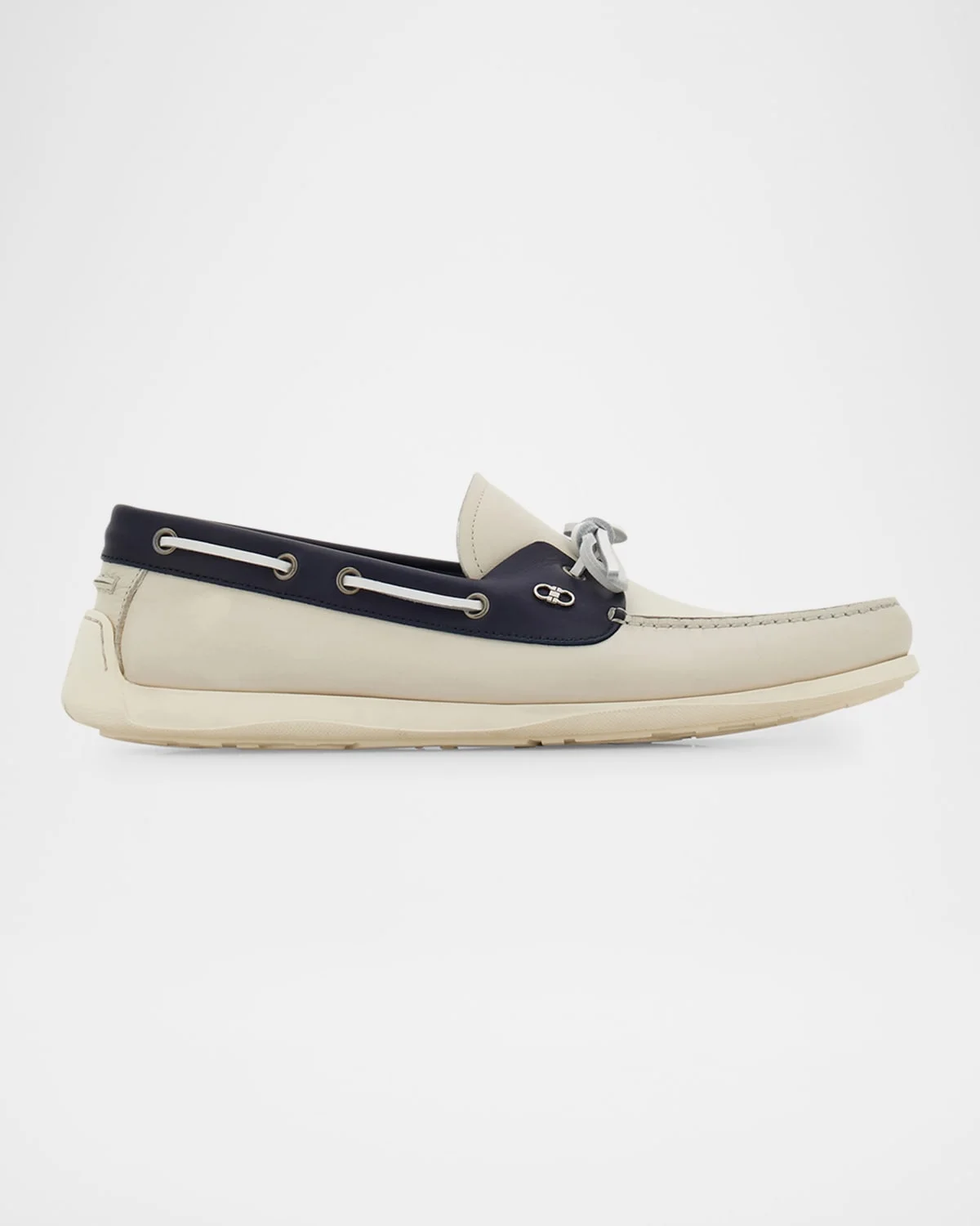 - Ferragamo "Bahia" boat shoe in two-tone leather - Flat heel - Round moc toe - Stitching around the collar - Slip-on style - White rubber outsole - Lining: Goat leather/leather - Professional cleaning recommended - Made in Italy