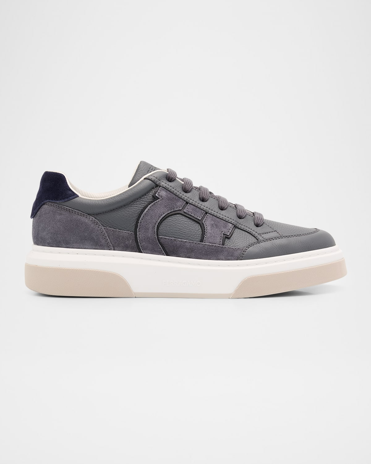 - Ferragamo sneakers crafted from grained leather and suede, displaying a distinctive Gancini inlay on the side - Flat heel - Round toe - Lace-up vamp - Tongue logo - Padded collar - Lambswool/leather/nylon lining - Textured rubber outsole with custom tread - Made in Italy