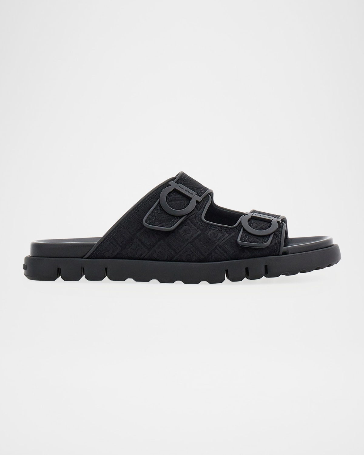 - Ferragamo "Colly" sandals in signature Gancio jacquard - Flat heel - Open toe - Dual straps with tonal Gancio buckles - Molded footbed - Slide style - Rubber outsole - Lining: Fabric/leather - Professional cleaning recommended - Made in Italy