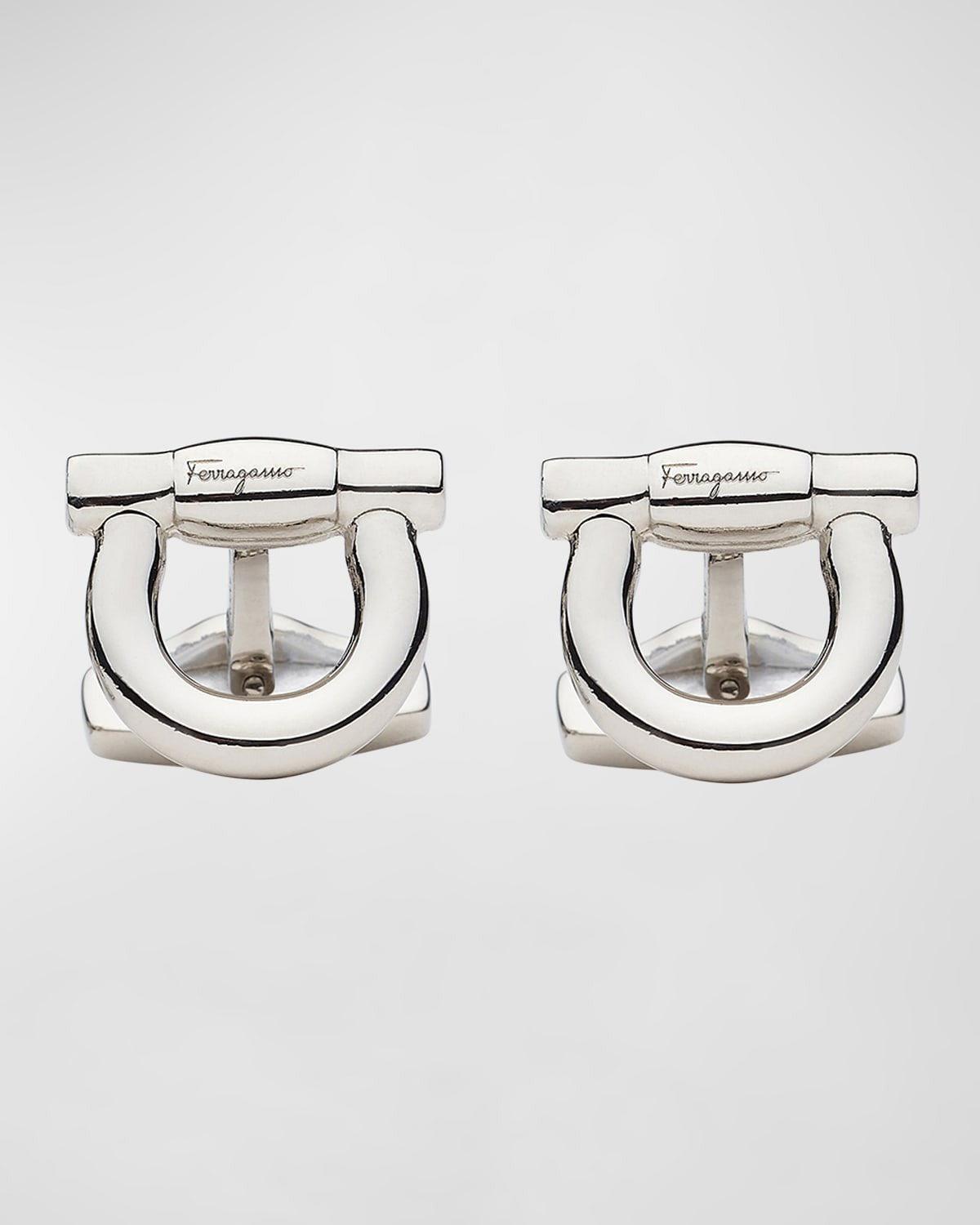 - Ferragamo cufflinks feature the Gancini silhouette - Silvertone brass - Whale back closure - Professional cleaning recommended - Made in Italy