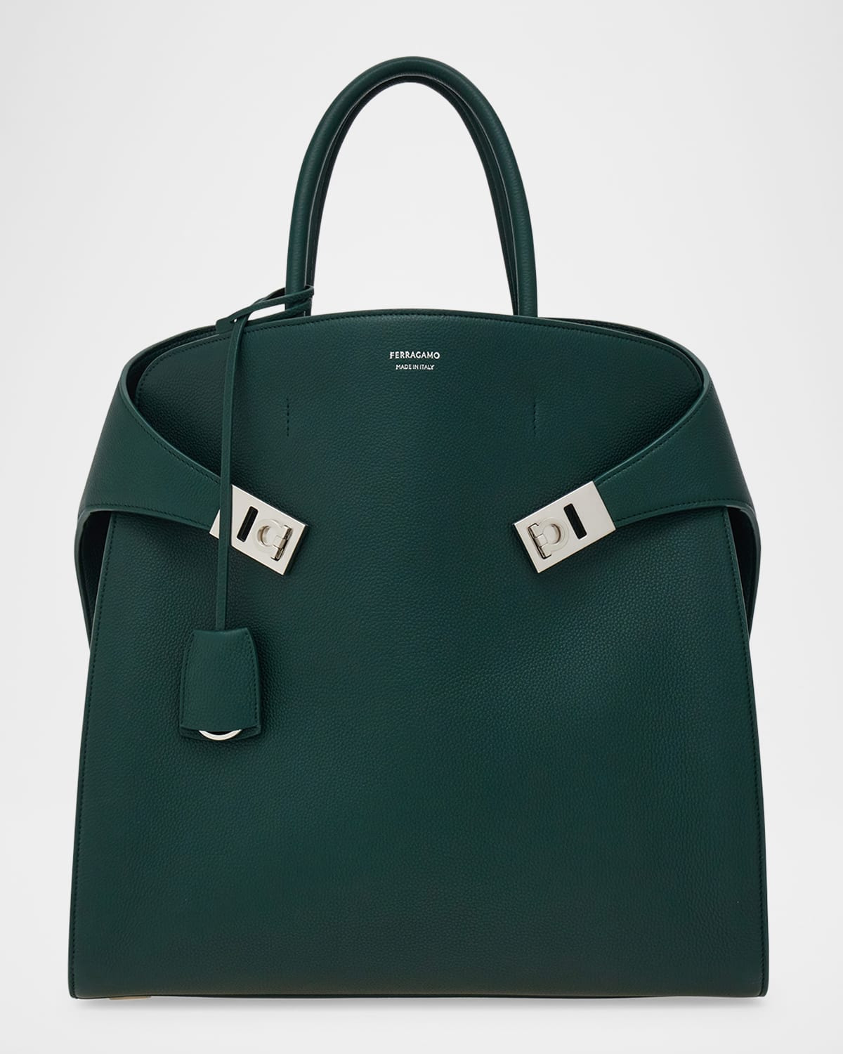 - Ferragamo "Hug" tote bag in hammered leather - Features an asymmetric back panel that wraps around to ‘hug’ the front via two wide straps with custom Gancini clasps - Foiled logo on the front - Removable leather shoulder strap - Two rolled top handles - Interior, one zip pocket - Cotton/leather/polyurethane lining - Rectangular protective foot studs - Silvertone hardware - Approx. 15.4"H x 15.0"W x 5.9"D - Leather/cotton - Made in Italy