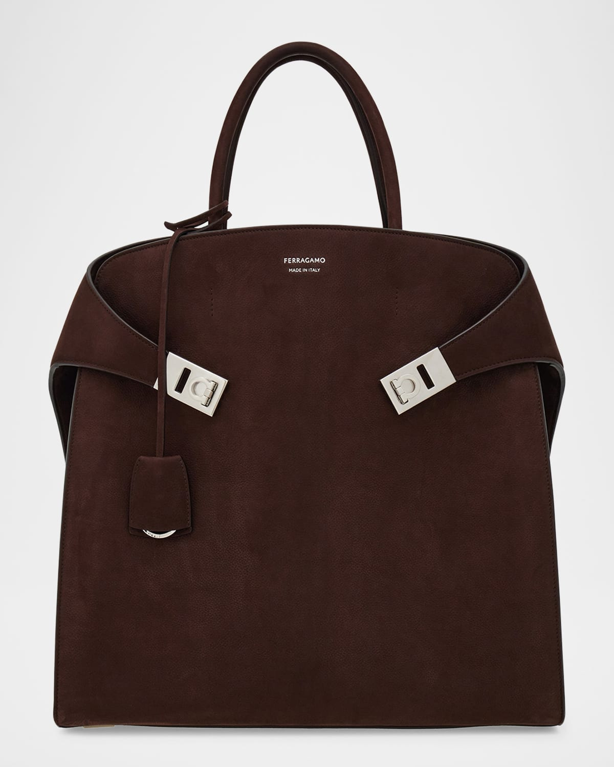 - Ferragamo "Hug" tote bag in hammered calf leather - Features an asymmetric back panel that wraps around to ‘hug’ the front via two wide straps with custom Gancini clasps - Foiled logo on the front - Removable leather shoulder strap - Two rolled top handles - Interior, one zip pocket - Cotton/leather/polyurethane lining - Rectangular protective foot studs - Silvertone hardware - Approx. 15.4"H x 15.0"W x 5.9"D - Leather/cotton - Made in Italy