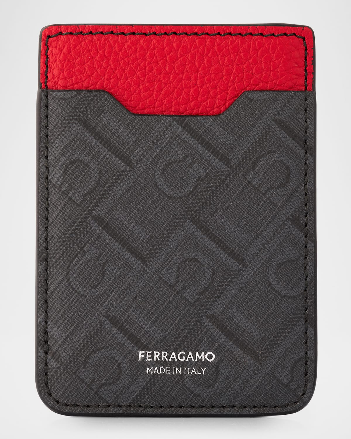 - Ferragamo card holder in hammered calfskin and coated fabric printed with the signature monogram - Logo lettering on front - One card slot - Approx. 3.9"H x 3.1"W - Professional cleaning recommended - Made in Italy