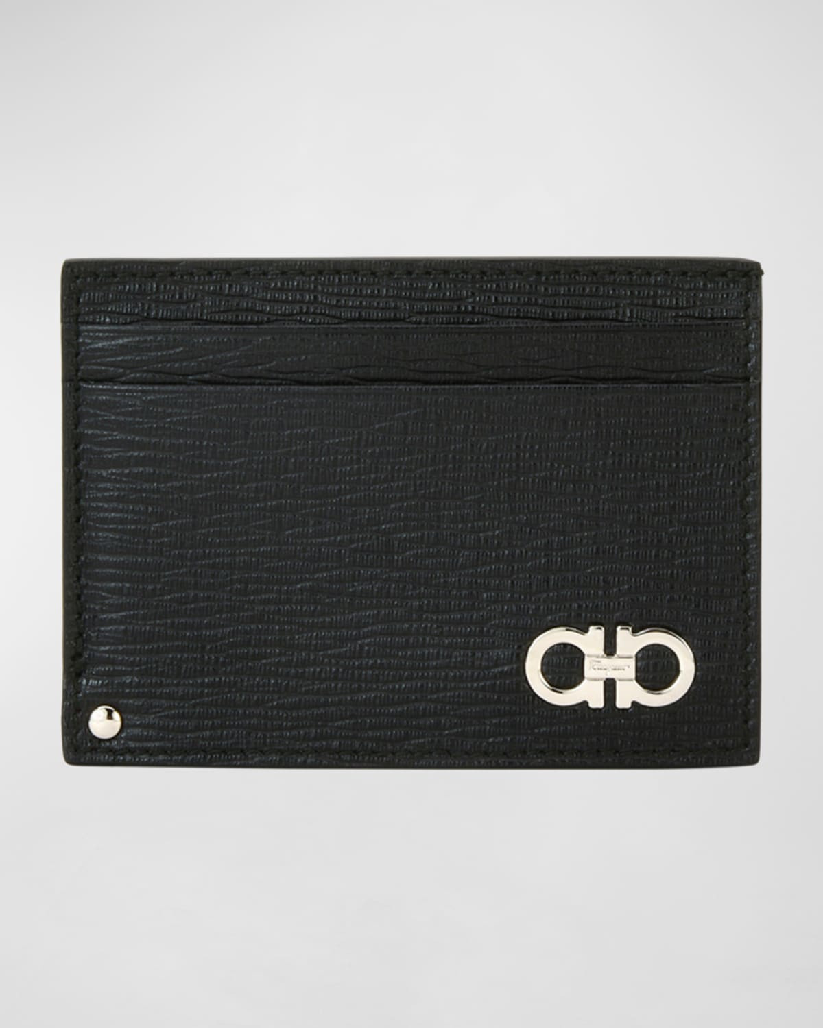 - Ferragamo card case in textured Revival leather. - Golden Gancini detail at corner; embossed logo on reverse. - Four card slots. - Flip-out ID window. - Leather lining. - 2.9"H x 4.3"W. - "Revival" is made in Italy.