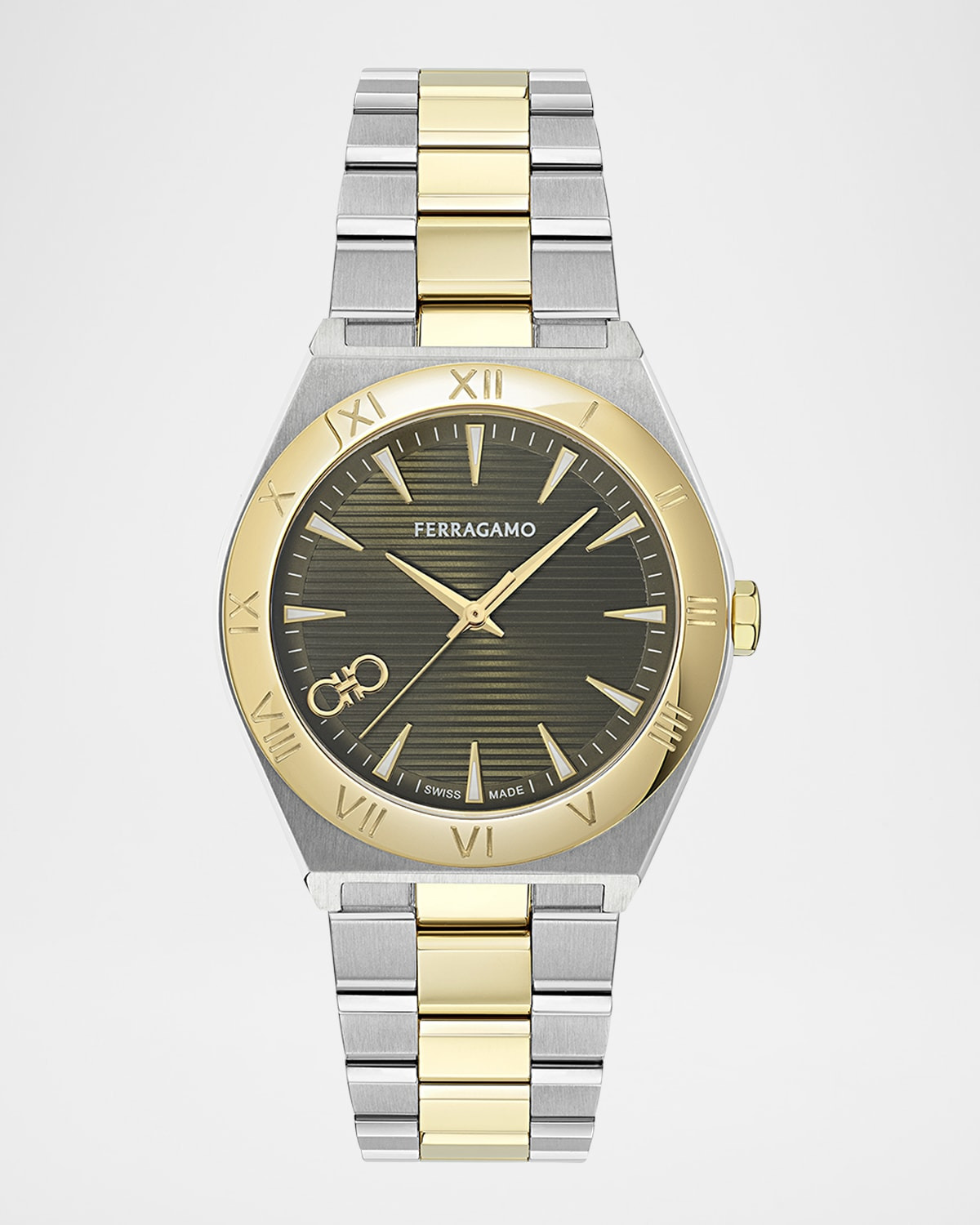 - Ferragamo "Vega Upper East" men's watch - 40mm; brushed and polished two-tone stainless steel case - Sapphire crystal glass - Guilloche dial - Logo at 12 o'clock - Gancini at 8 o'clock - Two-tone three-link bracelet - Deployant buckle - Water resistant at 5 ATM - Swiss quartz movement - Spot clean - Made in Switzerland