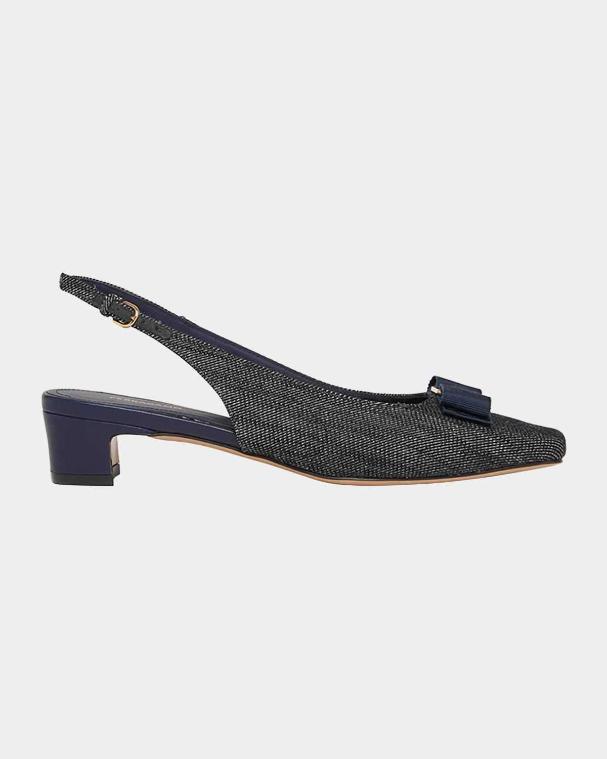- Ferragamo "Rivada" denim cotton pumps adorned with a logo-engraved bow accent - 1.25 in / 30 mm block heel - Square toe - Adjustable slingback strap - Leather outsole - Lining: Leather - Professional cleaning recommended - Made in Italy