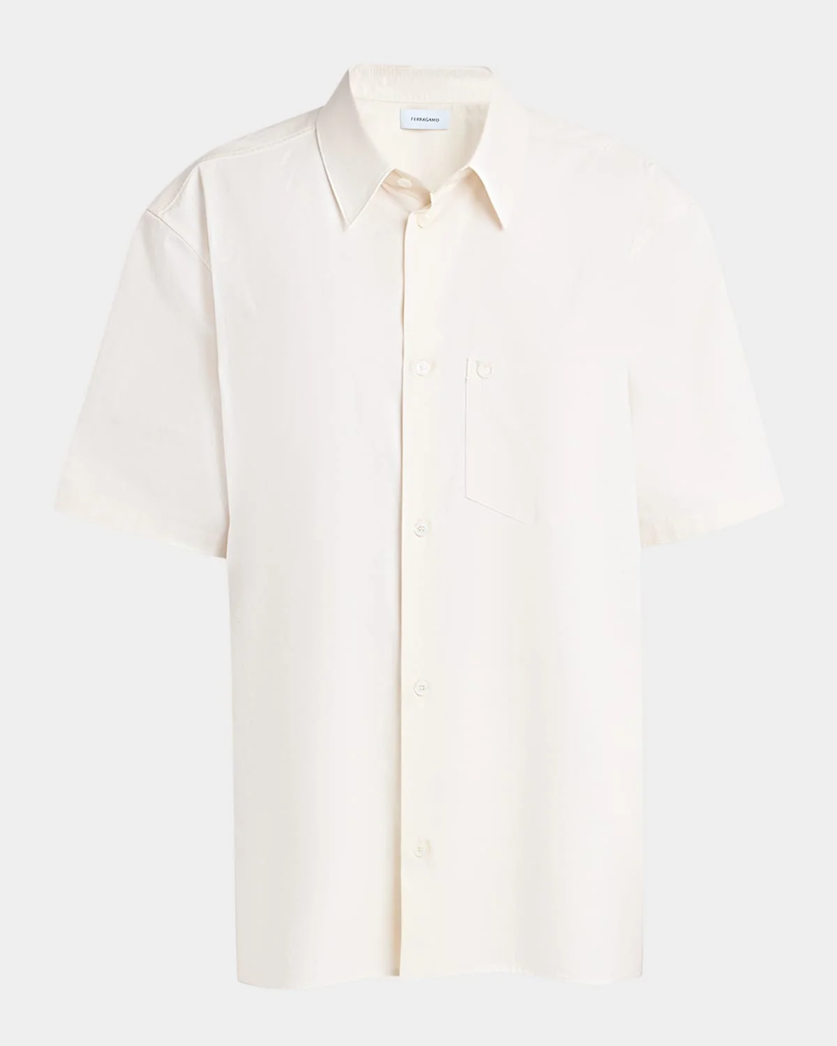 Ferragamo classic shirt is tailored in silk canvas Point collar; button front Short sleeves Chest patch pocket Loose fit Hem falls below the hip Cotton/viscose/elastane Made in Italy