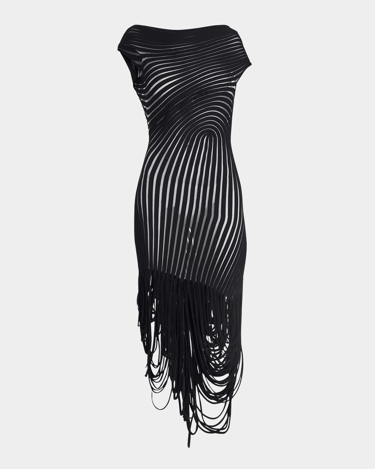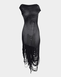 - Ferragamo dress in transparent contrast ribbed knit with a draped fringe hem - High neckline - Short sleeves - Body-skimming silhouette - Hem falls below the knee - Hidden closure - Viscose/polyester - Dry clean - Made in Italy