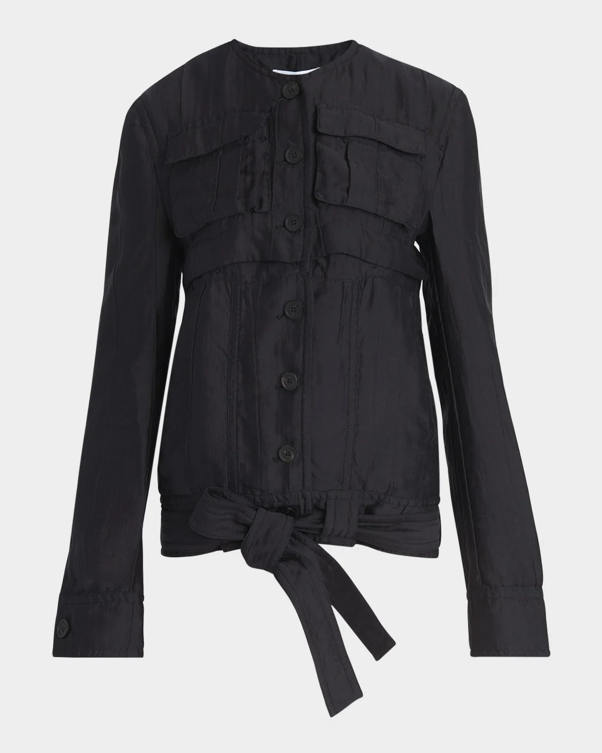 - Ferragamo triple silk organdie jacket featuring buttoned cut under the bust which the bottom section can be removed leaving a cropped jacket - Round neckline; single-breasted front - Long sleeves; button cuffs - Chest flap pockets - Straight fit - Hip length - Self-tie belted hem - Button closure - Silk/nylon/polyamide - Dry clean - Made in Italy