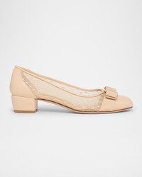 - Ferragamo "Vara" fresh and feminine pump features mesh inserts at the sides for an artisanal appeal. The structure is made of the softest kid leather at the heel and tip, and the trim that frames the delicate mesh sides. Available in both classic and seasonal hues, it has a tonal grosgrain bow with a golden buckle across the toe. - 1.25 in / 30 mm block heel - Round toe - Bow accent at vamp - Slip-on style - Leather outsole - Lining: Goat leather - Professional cleaning recommended - Made in Italy