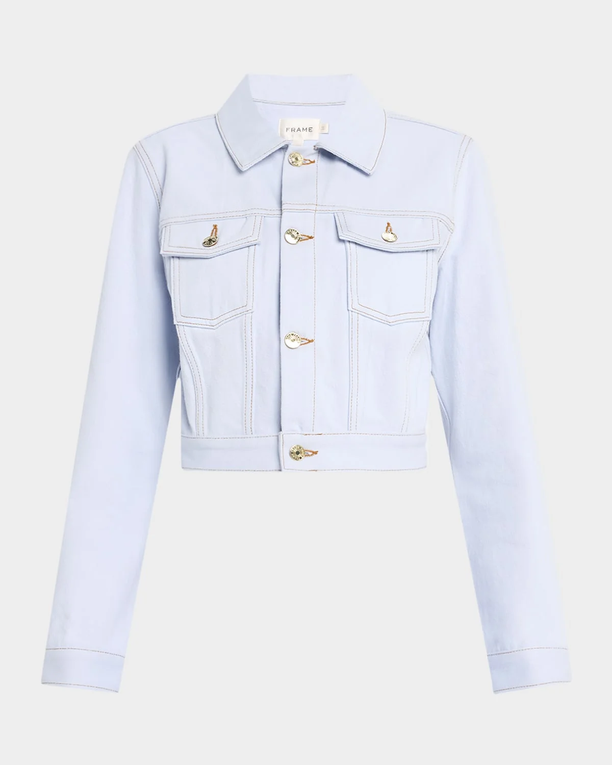 CH x FRAME "The Tailored Denim Jacket " in colored denim Point collar Long sleeves with button cuffs; approx. 18.5"L Dual chest pockets Tailored fit Buttonfront Cotton Machine wash cold, tumble dry Imported