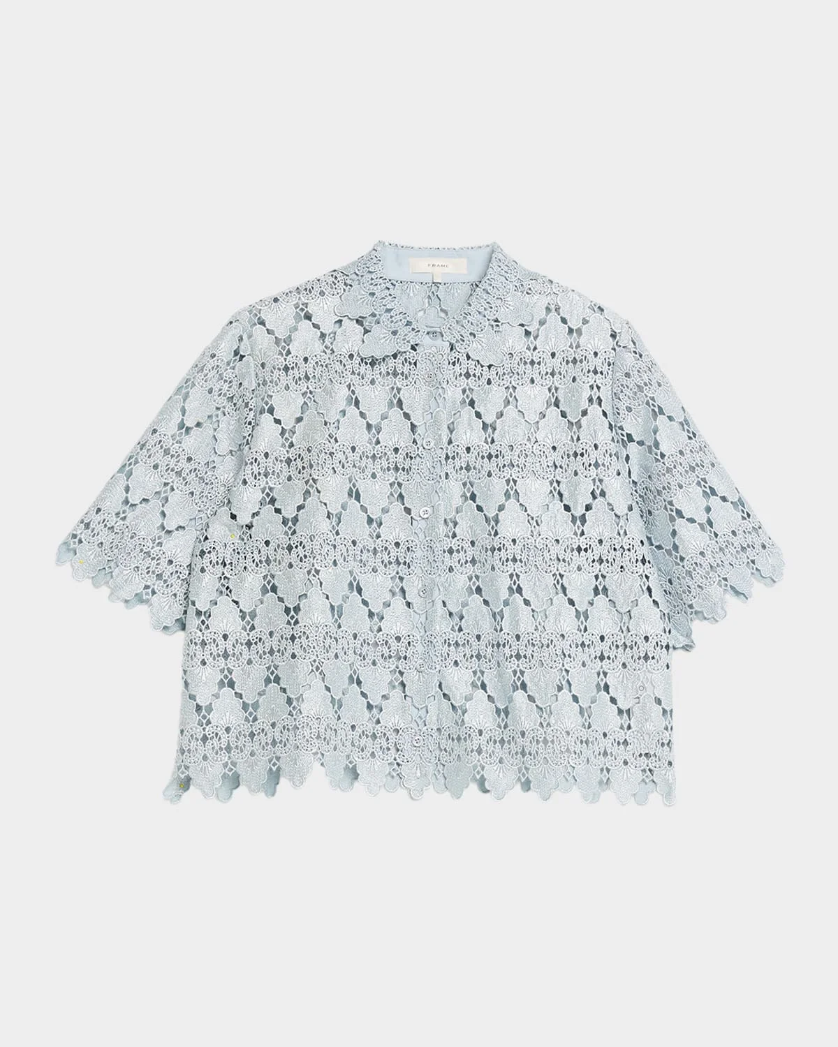 FRAME lace shirt featuring scalloped trim Point collar Short sleeves Classic fit Hem falls to the hip Buttonfront Polyester Dry clean Imported