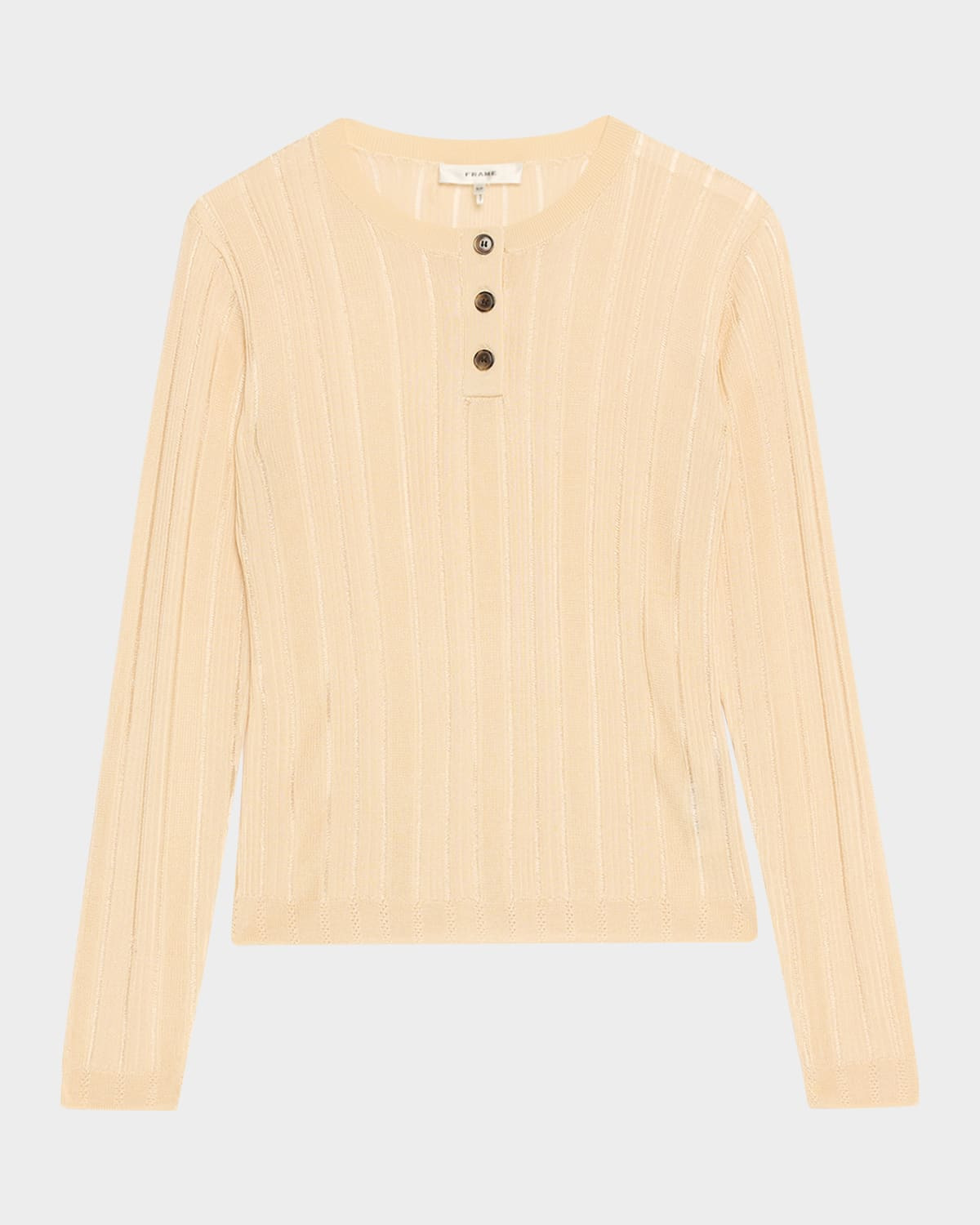 FRAME ribbed henley top Crew neckline; buttonplacket Long sleeves Easy fit Hem sits at the hip Pullover style Promodal® rayon Hand wash or dry clean Imported
