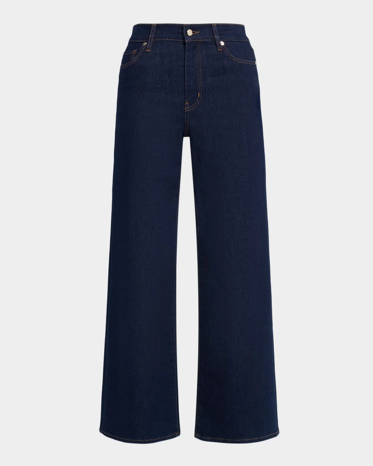 FRAME "Le Slim Palazzo" jeans in mediumwash stretchdenim Approx. 11" rise; 31" inseam High rise Fivepocket style Wide legs with a subtle flare Full length Button/zip fly; belt loops Cotton/polyester/lyocell Machine wash cold, inside out Imported