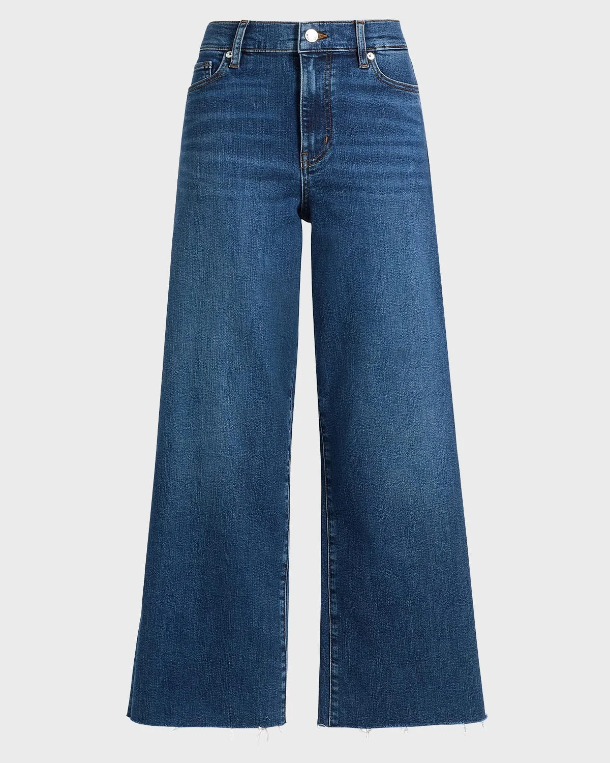 FRAME "Le Slim Palazzo" jeans finished with a raw hem in stretch denim Approx. 11" rise; 29" inseam High rise Fivepocket style Wide legs Cropped length Button/zip fly; belt loops Cotton/elastane Machine wash cold, inside out Imported