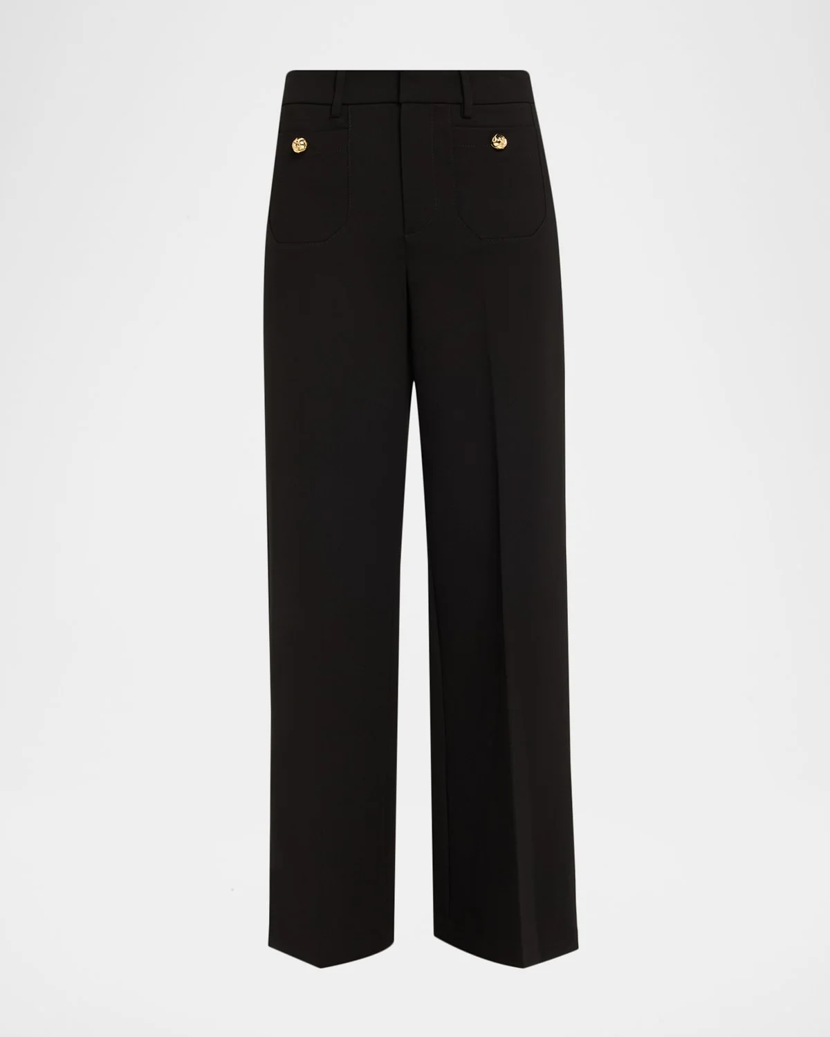 FRAME "Le Slim Palazzo" wideleg trousers crafted from matte crepe and finished with golden buttons High rise Front and back patch pockets Slim fit Full length Hook/zip fly; belt loops Viscose/nylon/polyamide/elastane Dry clean Imported