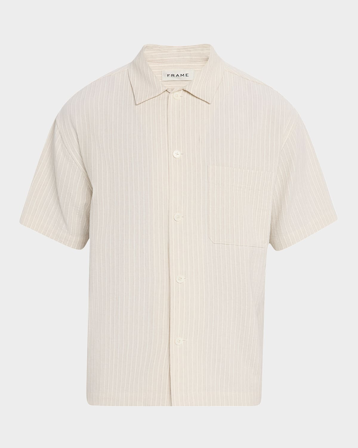 - FRAME sport shirt in tonal jacquard stripes - Camp collar - Button placket - Chest patch pocket - Short sleeves - Yoked back shoulders - Straight hem - Classic fit - Cotton/viscose/polyester - Machine wash cold - Imported