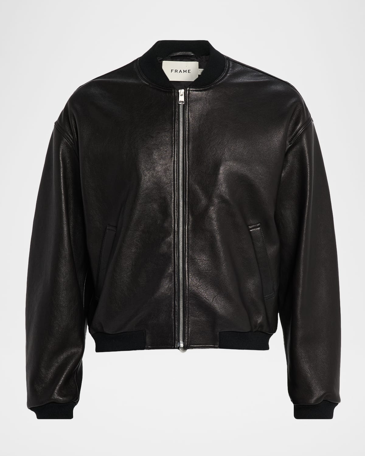 - FRAME bomber jacket in soft textured leather - Ribbed baseball collar - Full-zip front - Long sleeves - Side welt pockets - Ribbed cuffs and hem - Leather - Leather method dry cleaning - Imported