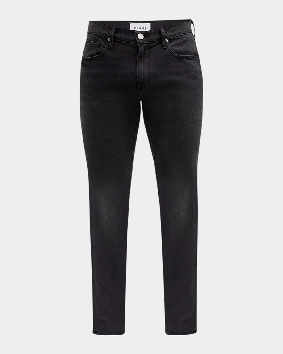 - FRAME "L'Homme Skinny" jeans in Noir wash with tonal stitching. - Approx. 10" front rise; 15" back rise; 32.5" inseam; 13" leg opening - Regular rise - Five-pocket style. - Skinny-leg fit; tapered at ankles. - Button/zip fly; belt loops. - Cotton/polyester/Lycra/spandex. - Made in Mexico. - Model is 6'1"/185cm.