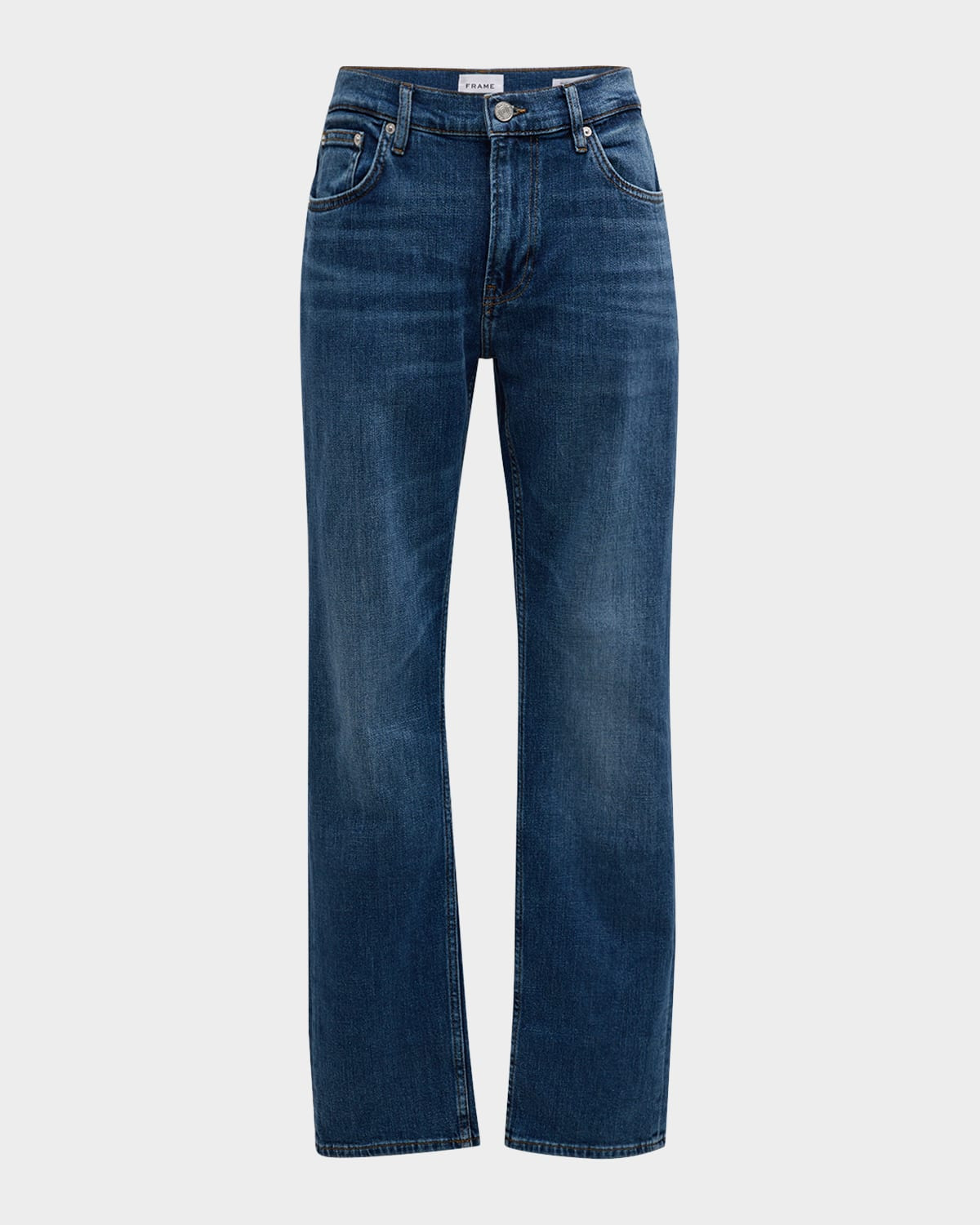 - FRAME jeans in dark-wash denim - Approx. 32" inseam; 11" rise; 15.5" leg opening; 16.9" knee - Mid rise - Five-pocket style - Full length - Modern fit; straight legs - Button/zip closure - Cotton/polyester/elastane - Unlined - Machine wash cold - Imported - Model is 6'1"/185cm.