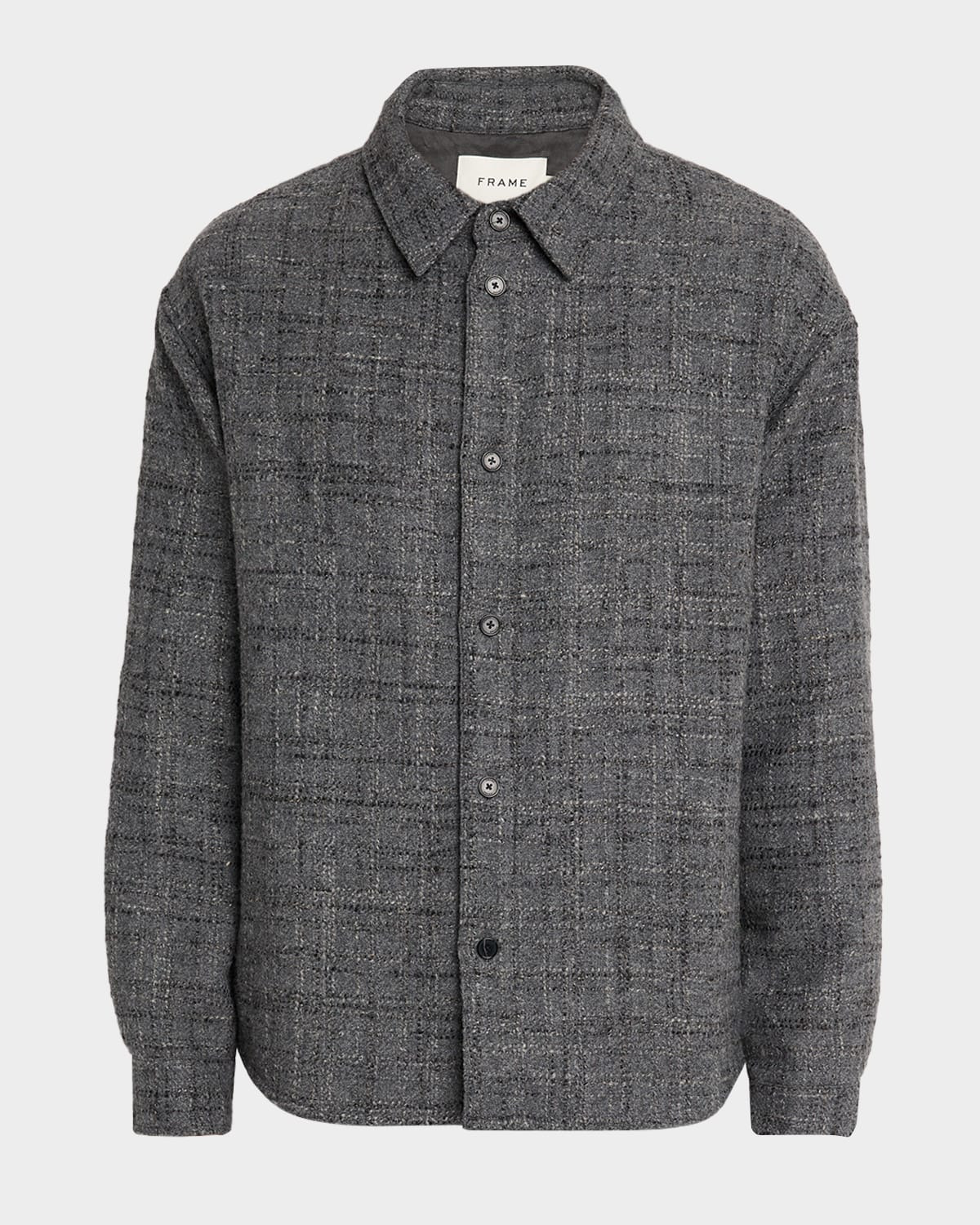 - FRAME overshirt in tweed - Point collar; button front - Long sleeves; barrel cuffs - Relaxed fit - Curved hem - Polyester/wool/virgin wool - Dry clean - Imported