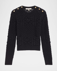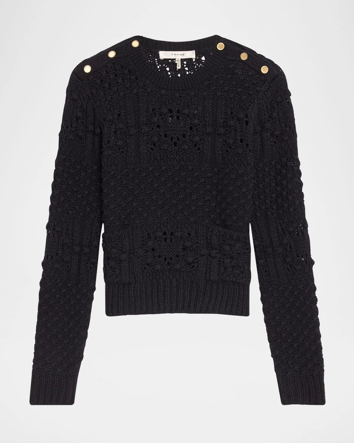 FRAME woolblend sweater featuring patch pockets and button detailing Crew neckline Long sleeves Classic fit Hem sits at the hip Pullover style Acrylic/wool Dry clean Imported