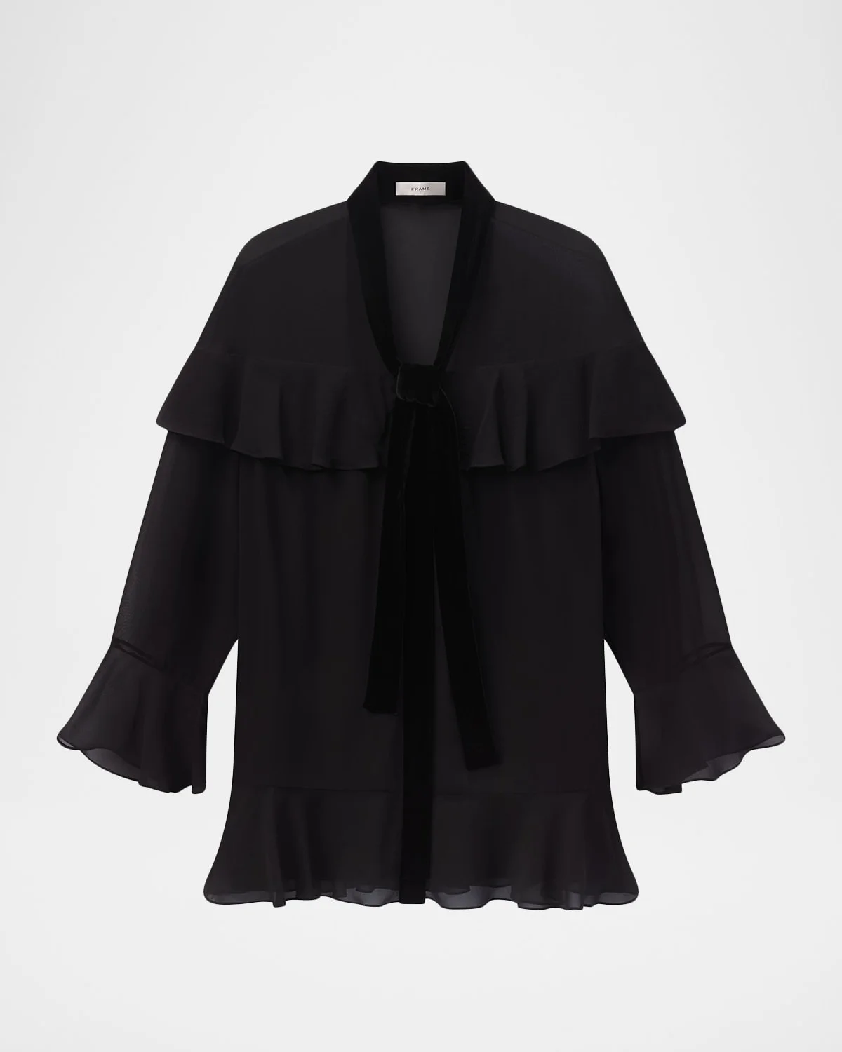 Crafted from luxurious silk, this FRAME mini dress is adorned with a velvet tie and delicate ruffles for a feminine silhouette. V neckline Long bell sleeves Loose silhouette Hem falls above the knee Slipover style Silk/rayon/spandex Dry clean Imported