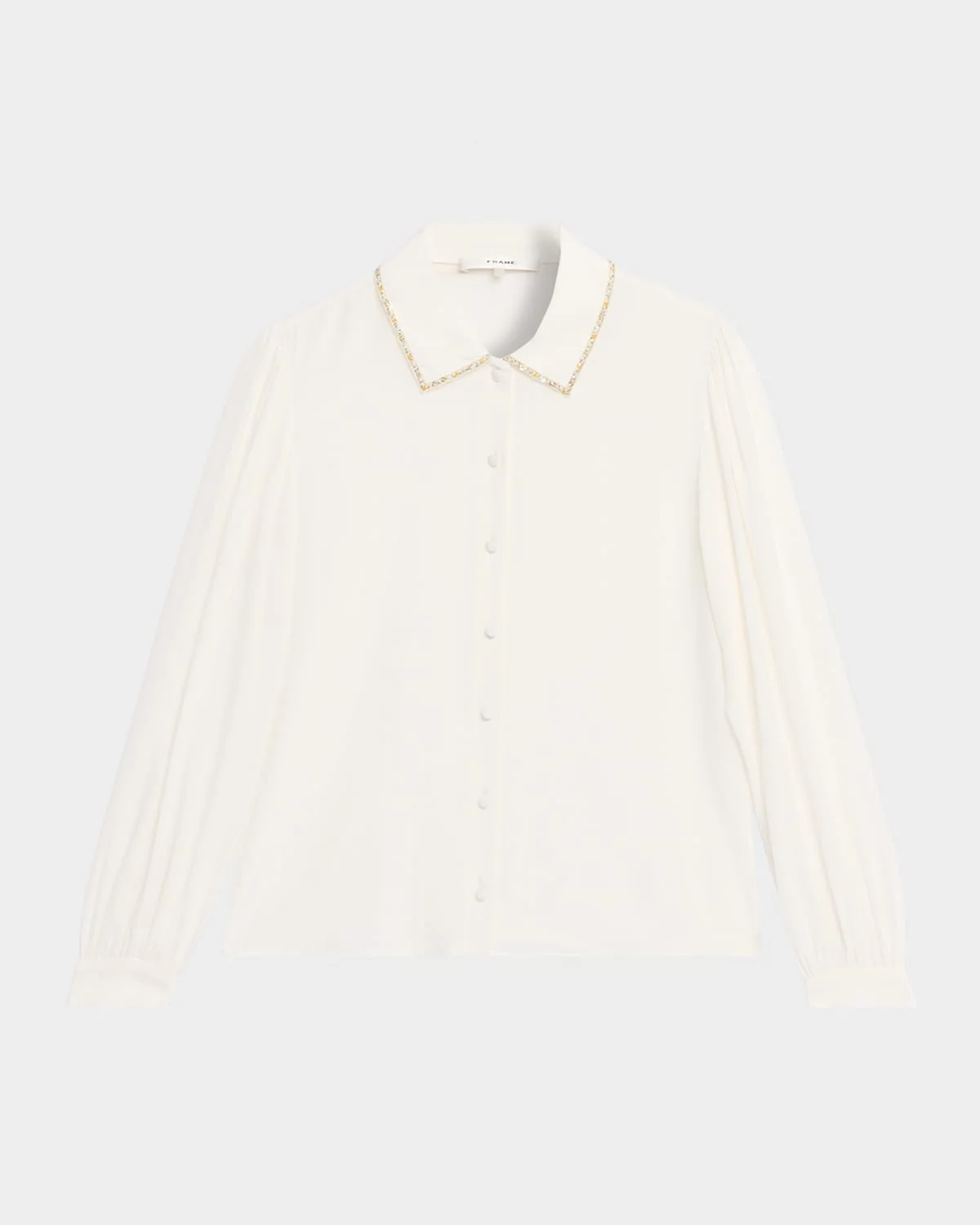 FRAME luxurious silk blouse adorned with a beaded collar Long sleeves with button cuffs Loose fit Hem falls to the hip Buttonfront Silk Dry clean Imported