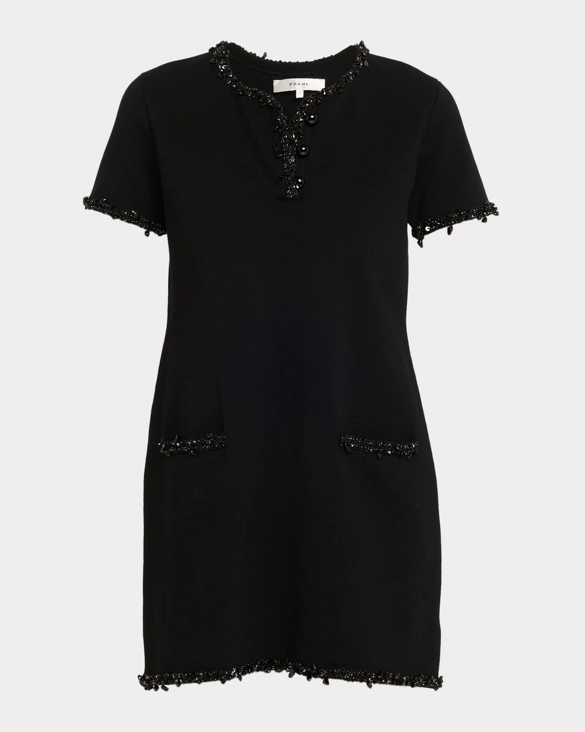 Crafted of merino wool, this FRAMEE mini dress is detailed with intricate beaded trim for a feminine touch. Crew neckline Short sleeves Front pockets Shift silhouette Hem falls above the knee Buttonfront Merino wool Dry clean Imported