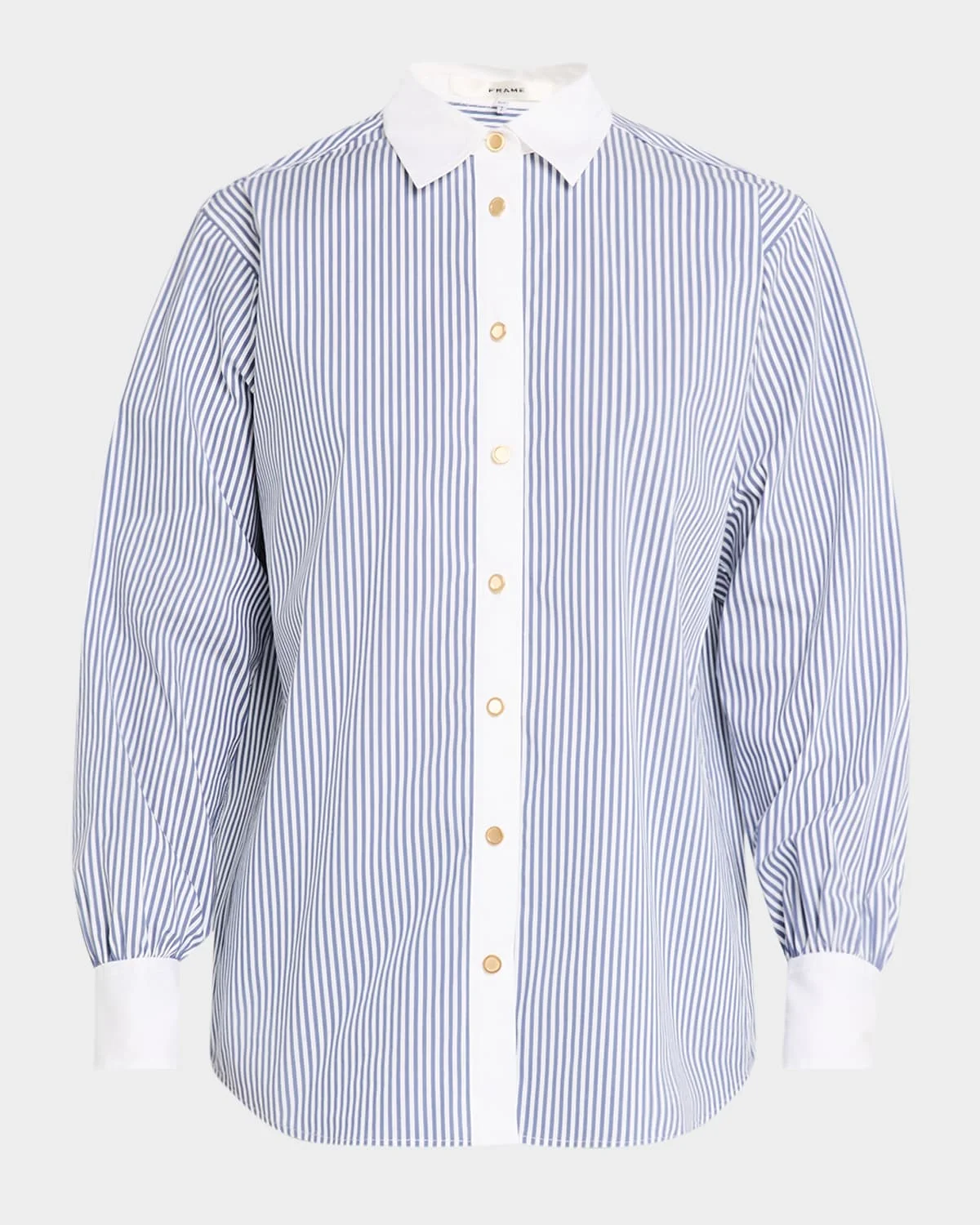 - FRAME "The Borrowed Shirt" featuring a stripe motif and solid trim - Point collar - Long sleeves with snap cuffs - Classic fit - Hem falls to the hip - Snap-front - Cotton/nylon/polyamide/spandex - Machine wash cold, tumble dry - Imported - Model is 5'10"/177cm.