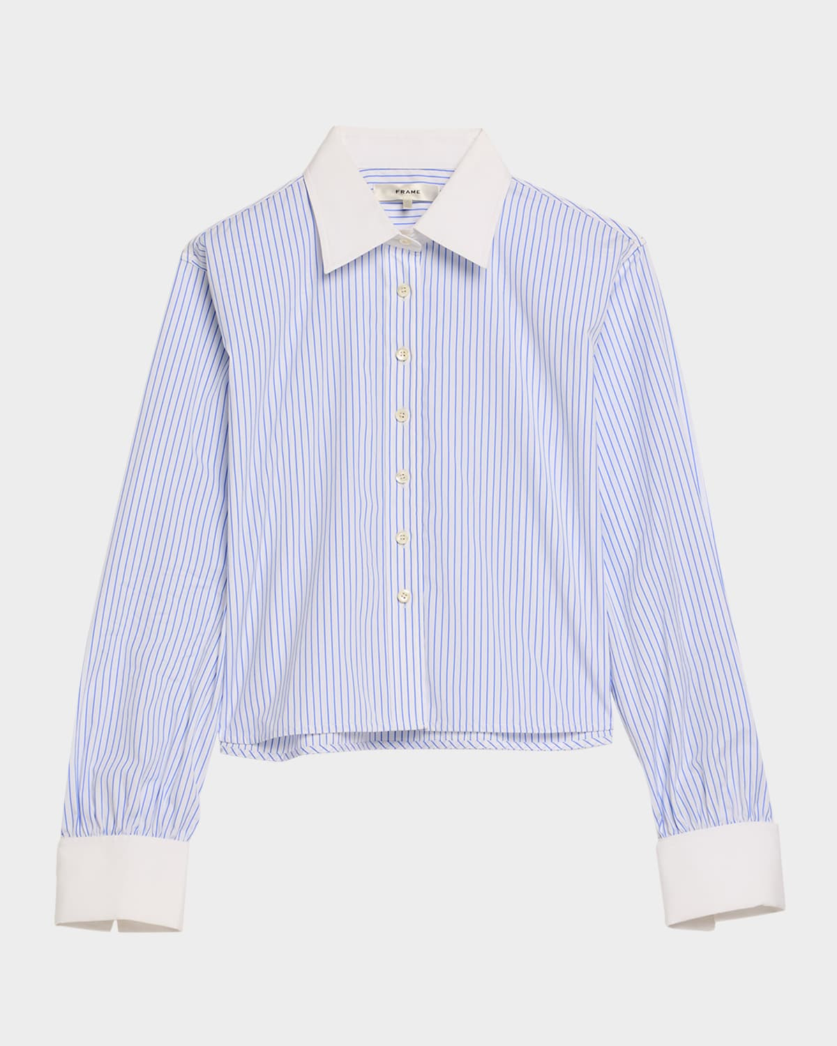 - FRAME "The Charles" pinstripe shirt with solid trim in crisp cotton poplin - Point collar - Long sleeves with button cuffs - Cropped fit - Rounded high-low hem - Button-front - Cotton - Machine wash cold separately - Imported