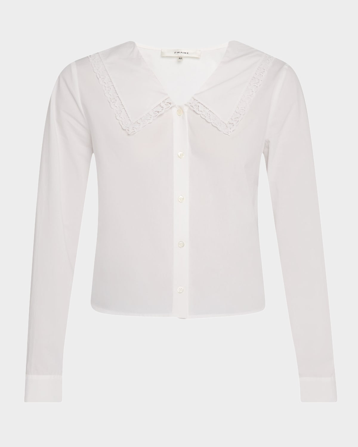 - FRAME "The Charm" blouse featuring a lace-trim collar - Long sleeves with button cuffs - Classic fit - Hem sits at the hip - Button-front - Cotton - Dry clean only - Imported