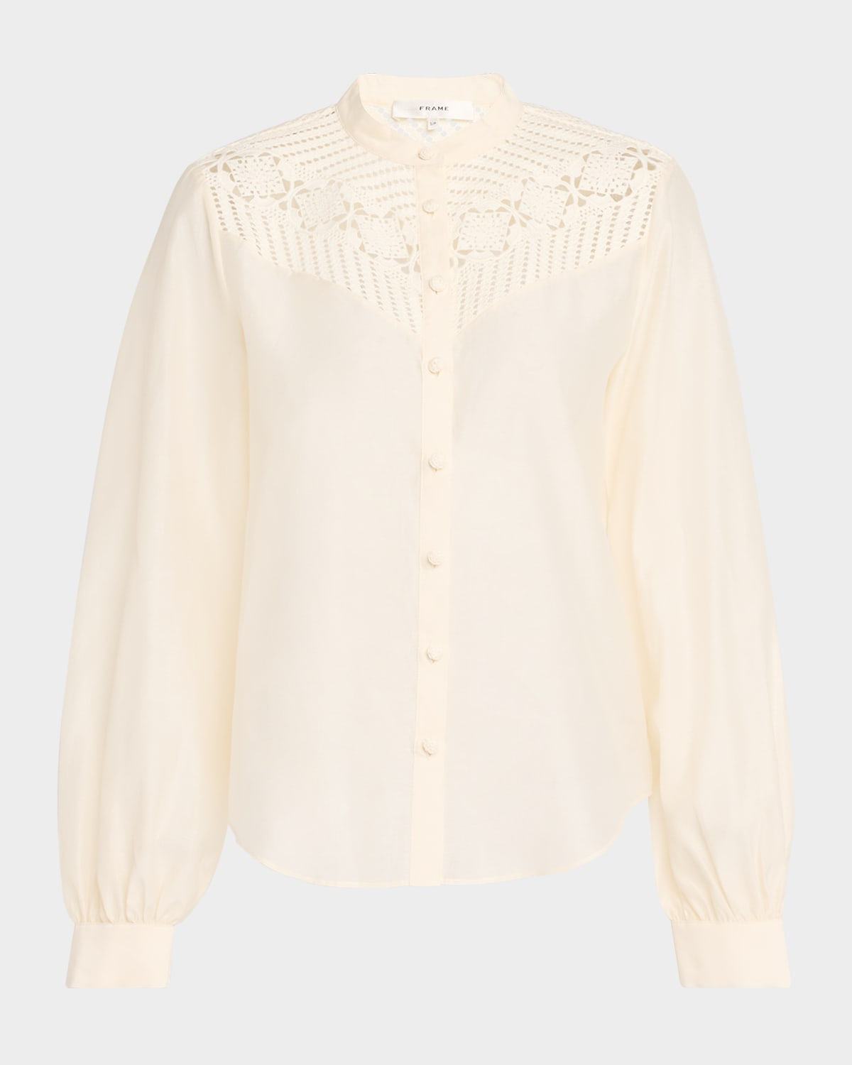 - FRAME cotton blouse decorated with a crochet inset - Slight stand collar - Long sleeves with button cuffs - Classic fit - Hem falls to the hip - Button-front - Cotton - Dry clean - Imported