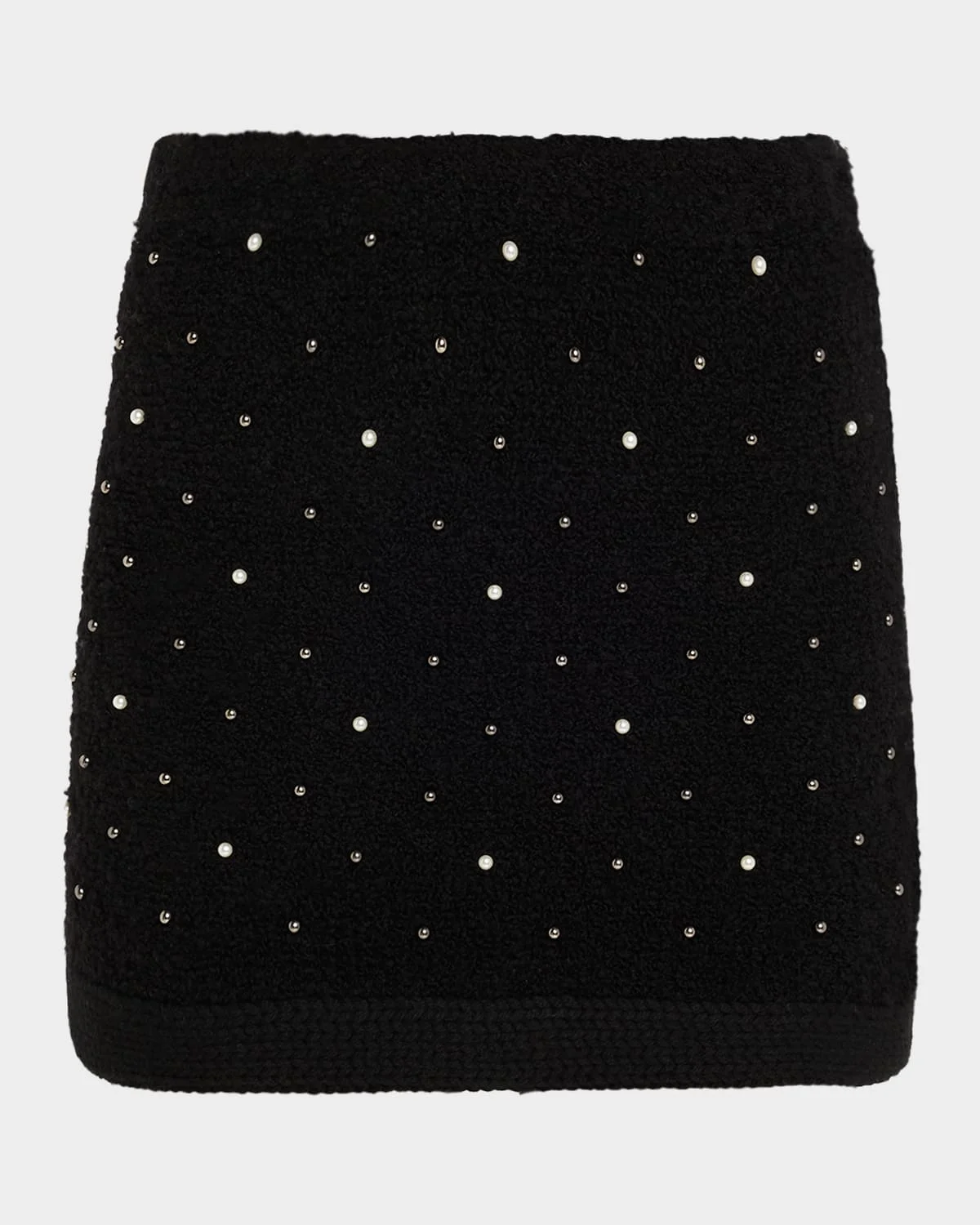 Knitted in a soft wool blend, this FRAME mini skirt is adorned with shimmering rhinestones and pearls High rise Elasticized waistband Skirt falls straigth from hip to hem Hem falls above the knee Pullon style Wool/nylon/polyamide Dry clean only Imported