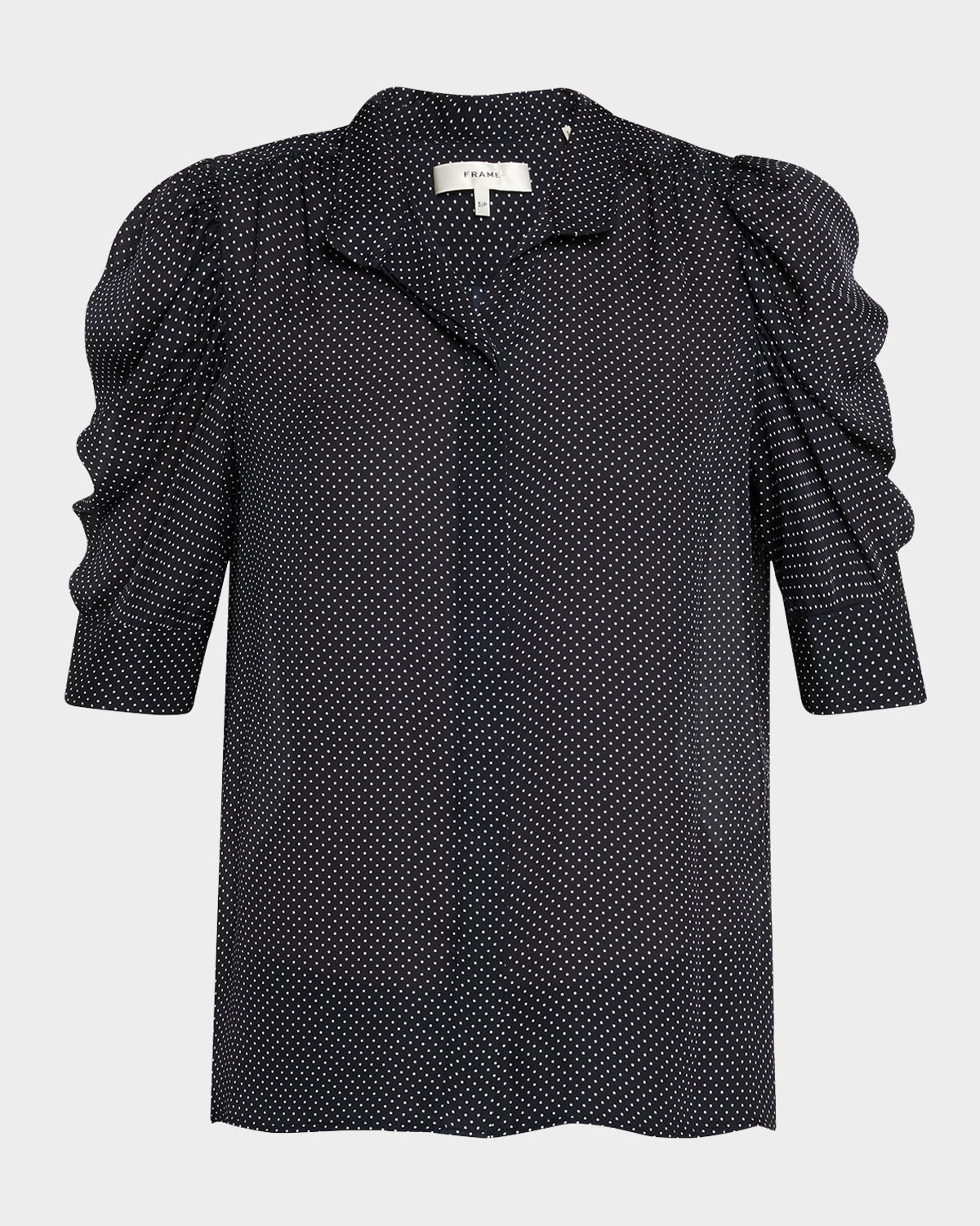 - FRAME "Gillian" silk top in polka dot - Point collar - Short ruched sleeves with button cuffs - Classic fit - Hem falls to the hip - Concealed button-front - Silk - Dry clean - Imported