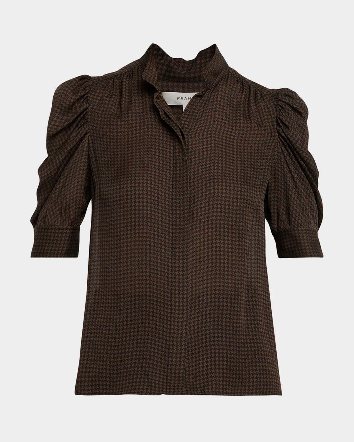 FRAME luxurious silk blouse in houndstooth Spread collar Ruched sleeves Classic fit Hem falls to the hip Hidden buttonfront Silk Imported