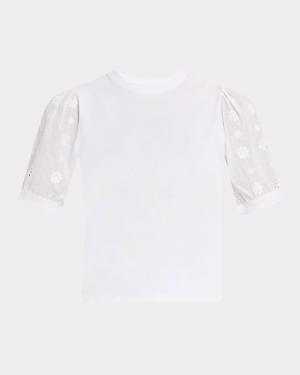- FRAME "The Lace Sleeve Tee" crafted from a soft cotton-blend - Crew neckline - Puff sleeves - Classic fit - Hem sits at the hip - Pullover style - Organic cotton/polyester/cotton - Dry clean or hand wash - Imported